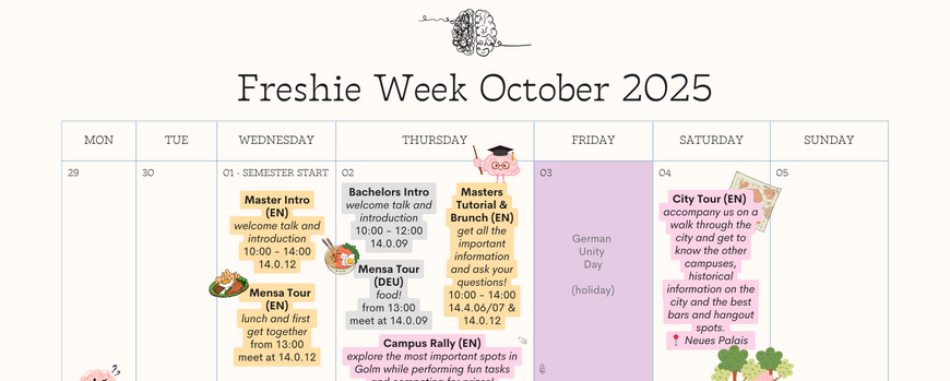 Wir können es kaum abwarten, die neuen Bachelor- und Masterstudenten der Kognitionswissenschaften zu begrüßen und haben zwischen dem 1. und 10. Oktober informative, lustige und leckere Events für euch geplant. Werft einen Blick auf den Plan und kommtzu so vielen Events wie möglich! Eventuell kommen noch Bar- und Cafèabende in Berlin und Potsdam dazu, also schaut immer mal hier oder auf Instagram vorbei.