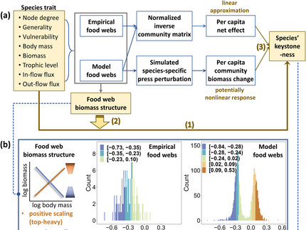 We use a large data set of 144 empirical food webs that provides estimates of species' average biomasses and quantitative mass-balanced fluxes between them to calculate linear approximations of the net effects species have on each other and we complement this data with direct simulations of the non-linear population dynamics of model-generated food webs. This allows us to assess species' keystone-ness with two independent methods and to expand the range of scaling between species' body mass and biomass (i.e., how bottom-heavy or top-heavy the biomass distribution in a food web is). A key finding is that the relationships between species' energetic or structural traits and their keystone-ness are highly context dependent and may even be opposite in food webs with bottom-heavy or top-heavy biomass distribution.