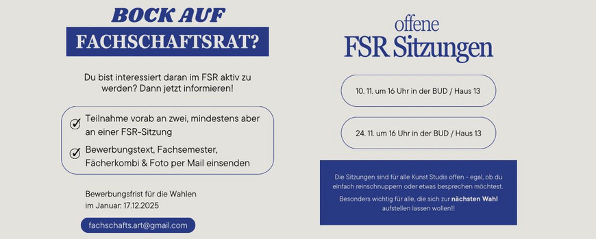 Du hast ein Anliegen, welches du ansprechen oder willst einfach mal schauen, wie der FSR arbeitet? Dann komme gern zu einer unserer offenen FSR Sitzungen! Die Sitzungen sind für alle Kunst Studis offen - egal, ob du einfach reinschnuppern oder etwas besprechen möchtest.
