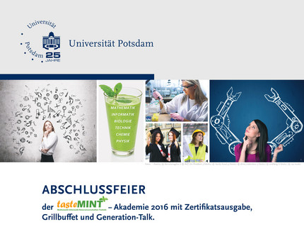 Am 13. Juli 2016 feiern die Absolventinnen der diesjährigen tasteMINT-Akademie auf dem Dach des Bildungsforums in Potsdam ihre Teilnahme am Potenzial-Assessment-Center. Neben der feierlichen Zertifikatausgabe werden die Schülerinnen die Gelegenheit haben, mit anderen Teilnehmerinnen und Alumnae des Verfahrens sowie erfolgreichen Frauen der Gleichstellung und der MINT-Studienfächer ins Gespräch zu kommen. Das Team des Bereichs MINT vom Koordinationsbüro für Chancengleichheit wird hierbei für ein vielseitiges Grill-Buffet sorgen.