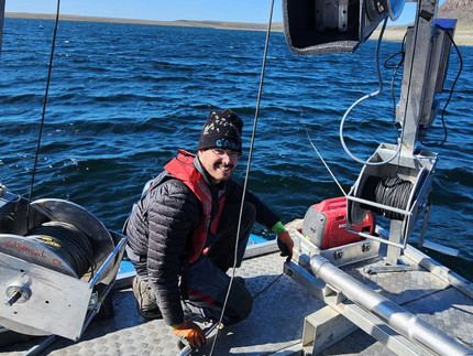During our time of working at the frozen lake – where the ice was nearly 1 meter thick - we lived at a remote research station and had multiple tasks. These included collecting water and snow samples, drilling ice cores, and, most notably, retrieving sediment cores from water depths of up to 110 m using specialized coring equipment.