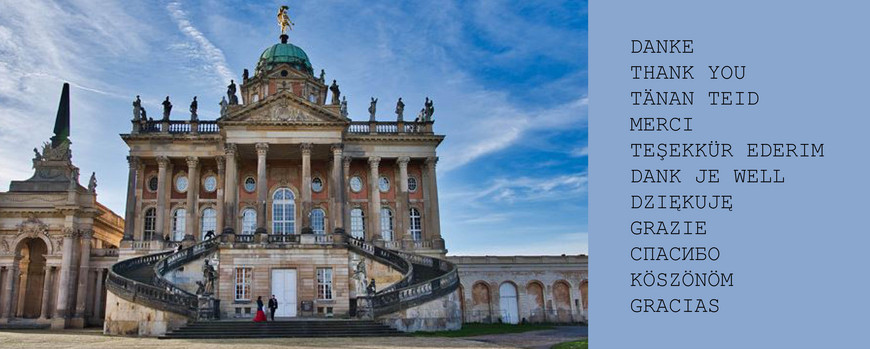 Eine Architektur, wie sie kaum beeindruckender sein könnte: zwei symmetrisch angeordnete palastartige Pavillonbauten mit Kuppelaufsatz und Säulen vor den Eingängen, zu denen schwungvolle Freitreppen emporführen. Nutzen Sie für ein spezielles Event den Balkon und die Freitreppen der sogenannten Communs. Vom Balkon der Communs schaut man direkt auf das Neue Palais. Der Balkon ist eine erstklassige Location für Events, die durch ihre Aussicht und ihre elegante Atmosphäre beeindruckt.