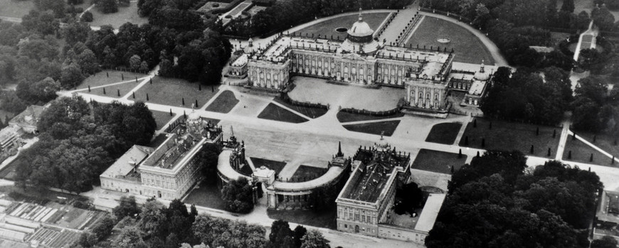 After the First World War, the Prussian “Administration for State Palaces and Gardens,” which was founded in 1927, presented the Neues Palais as a museum in the style of Friedrich the Great. Beginning in 1921, officials of the Police Academy were housed in the northern Commun. Potsdam citizens later moved into the apartments that were established here. The southern Commun was converted after 1933 to meet the needs of the leadership academy of the Reich Labor Service. Between 1919 and 1945, the Marstall hosted a variety of tenants in quick succession, including the postal service, the police, and from 1937 on the Luftwaffe’s air traffic control academy. The facades of the Communs were renovated for the Olympic Games in 1936. The castle grounds were spared for a long time from Allied bombing runs in the Second World War. The Neues Palais even went unharmed during the “Night of Potsdam” from April 14 to 15, 1945, when almost 1,800 tons of bombs were dropped on the city center. The combat of the war’s closing days dealt the first blows to the ensemble. The theater wing of the palace and the Colonnade were heavily damaged, and the southern Communs was completely gutted by fire. The northern Commun was hit by grenade launchers, yet its basic structure remained intact.