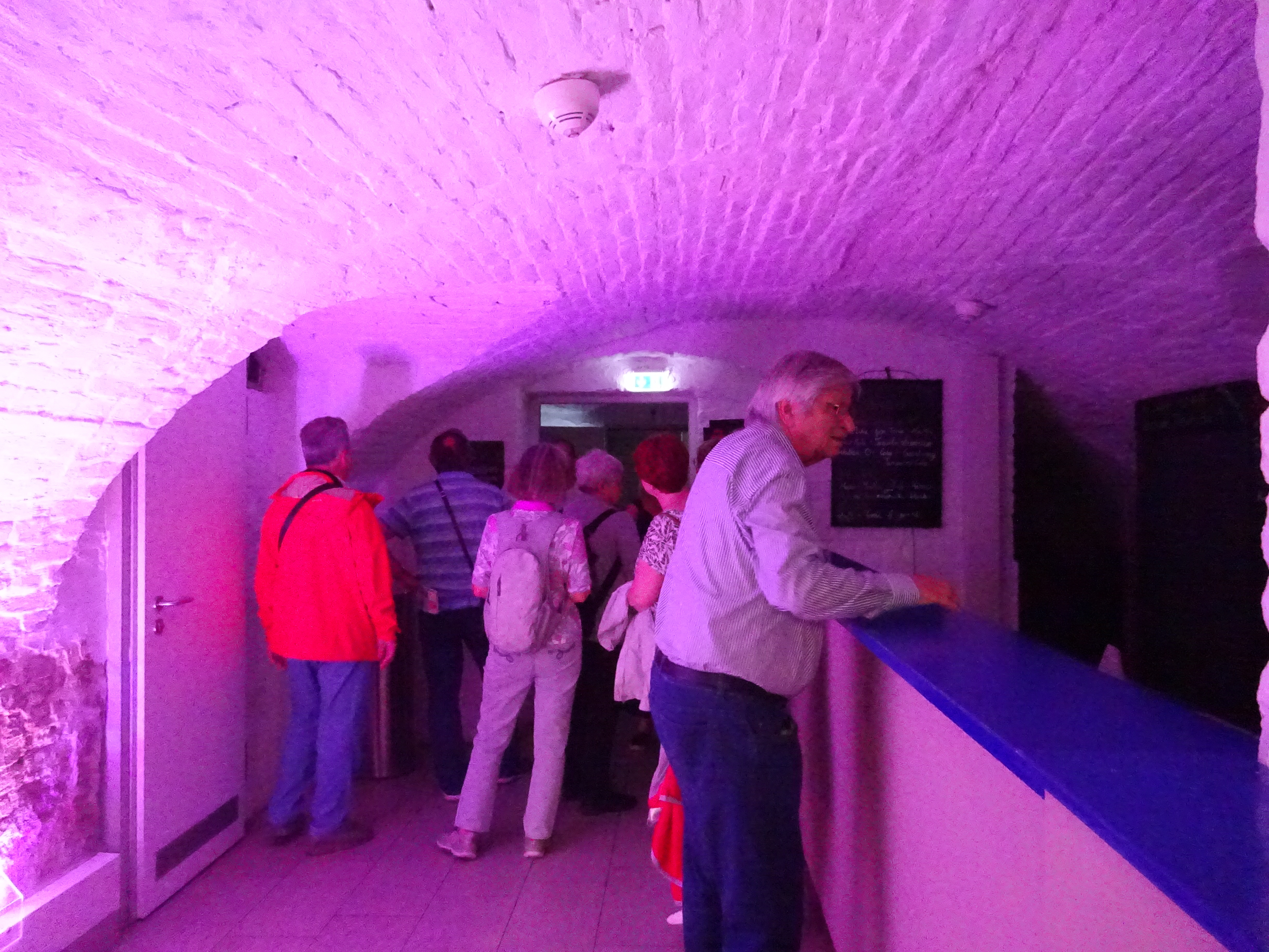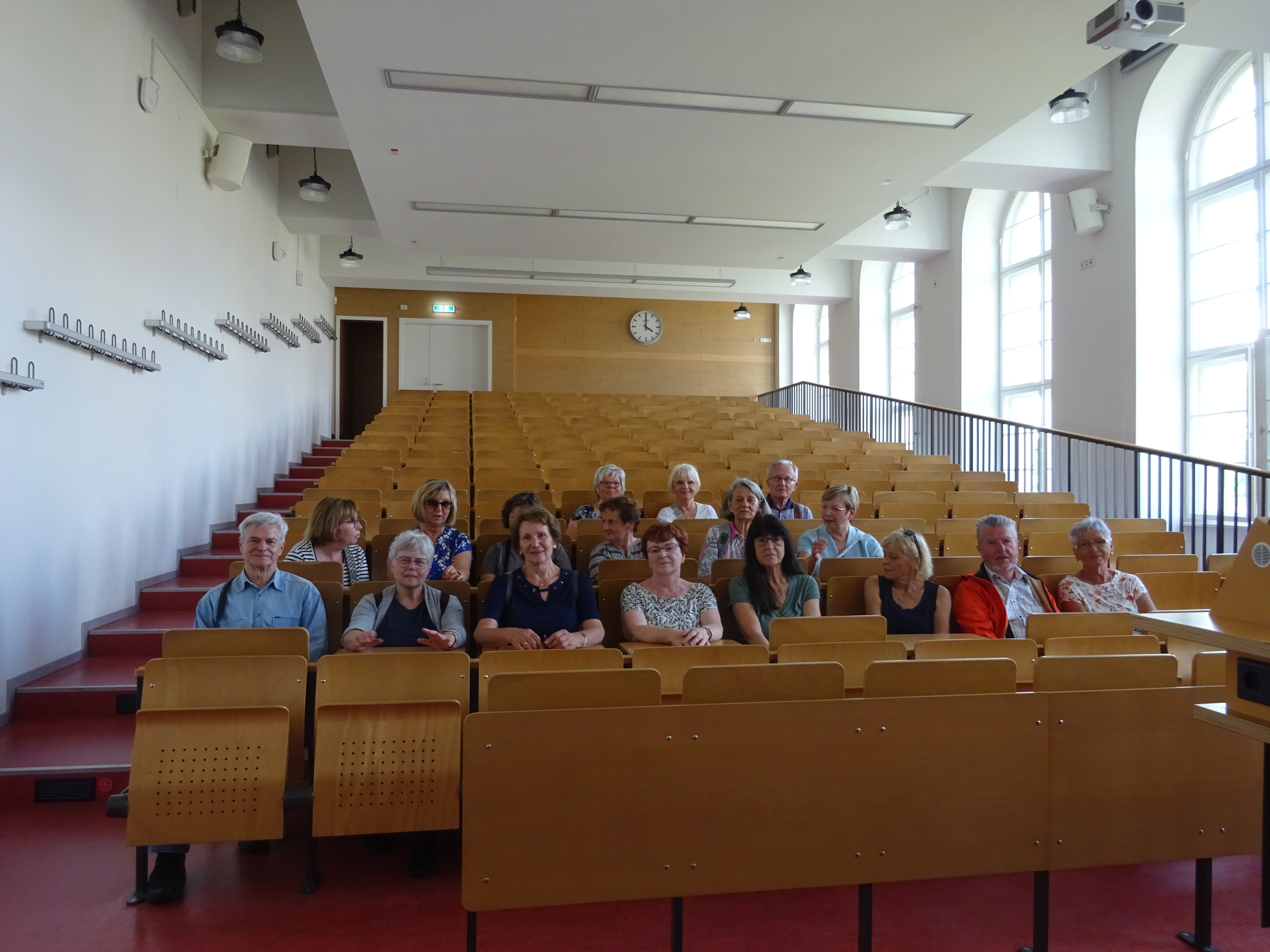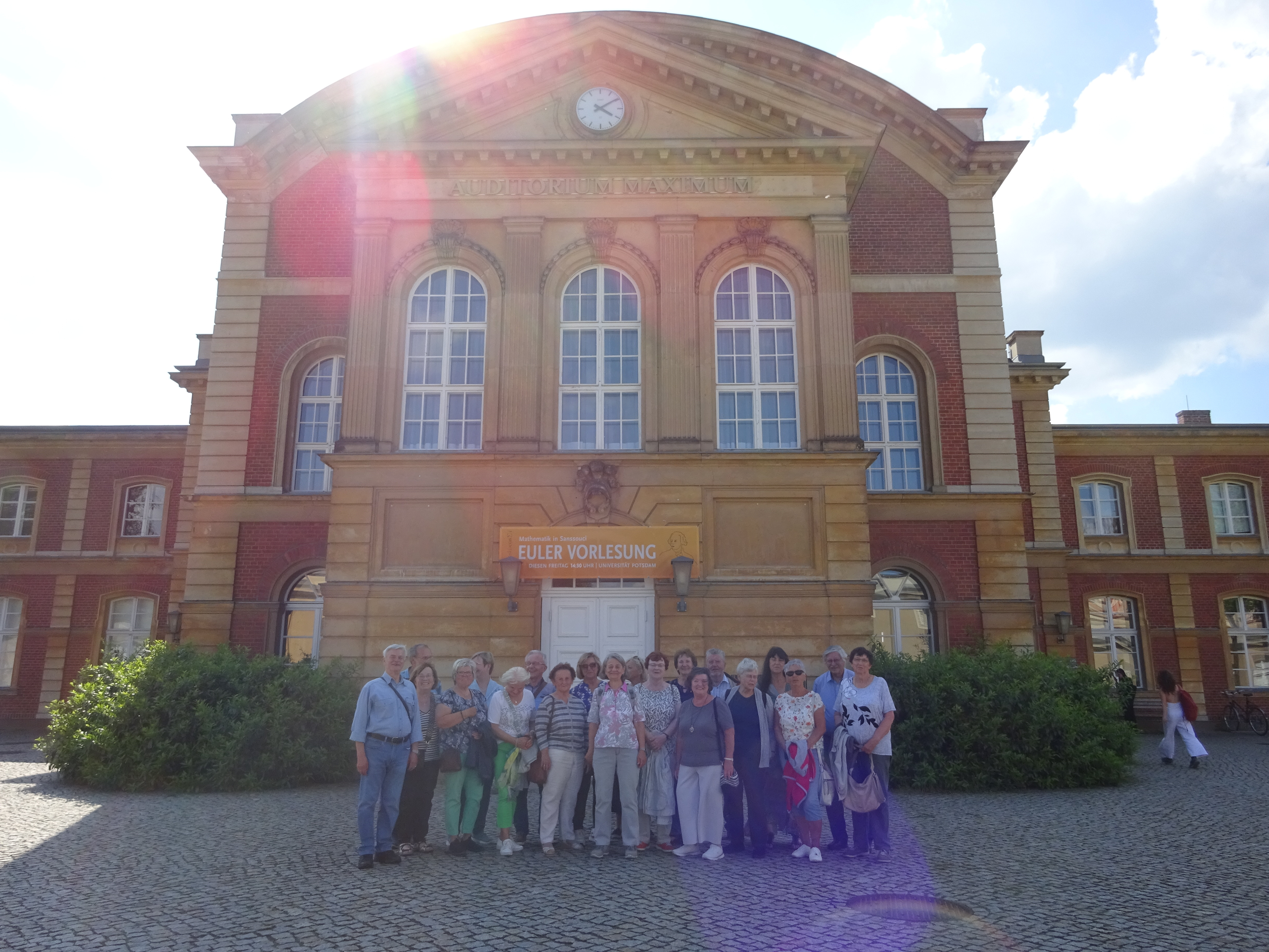 Zu Beginn wurde das Europäische Zentrum Jüdischer Gelehrsamkeit besichtigt, das sich im Nordtorgebäude befindet. Hier befanden sich zu ihrer Zeit eine Turnhalle und ein Wirtschaftsgebäude. Herr Martin Kujawa, Mitarbeiter der dortigen School of Jewish Theology, berichtete voller Stolz von dem zukunftsweisenden Studiengang, der erstmals in Deutschland Rabbiner und Rabbinerinnen ausbildet. Im Anschluss führte er die Gruppe durch die Synagoge, die durch ihre Schlichtheit und Modernität beeindruckte. Besichtigt wurden neben der Bibliothek in Haus 10 außerdem zwei Hörsäle in Haus 11 und Haus 9, in denen die Alumni sich an frühere Lehrveranstaltungen zurückerinnerten. Ihren Abschluss fand die Tour im Nil StudentInnenkeller. Die früheren Studierenden erzählten stolz, dass sie damals den Schutt aus dem Gewölbekeller räumten, um ihn wieder nutzbar zu machen. Bei einem kühlen Getränk ließen die Alumni ihr Jubiläumstreffen ausklingen. Heidemarie Mickler berichtete abschließend: "Von der Reservierung von Plätzen im Außenbereich der Mensa für unser selbstorganisiertes Picknick bis zur Verabschiedung im StudentInnenkeller gestaltete sich alles ausgezeichnet. Alle Teilnehmer waren begeistert, von den unterhaltsamen und informativen Stunden am Neuen Palais."