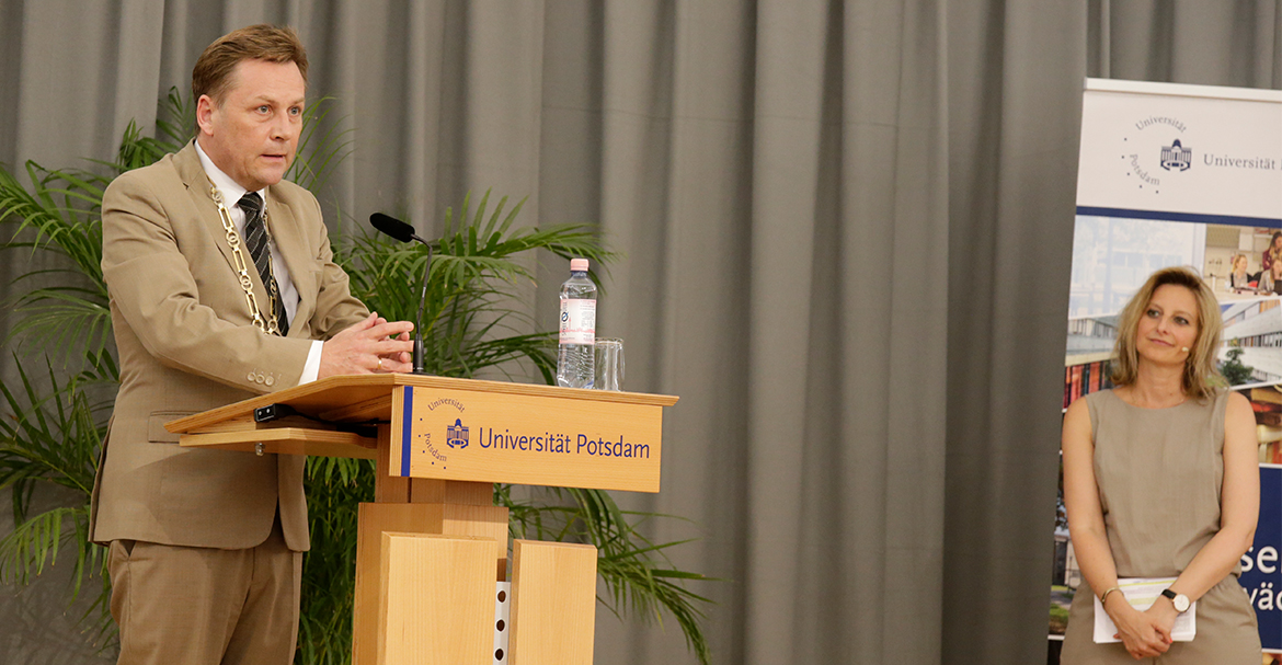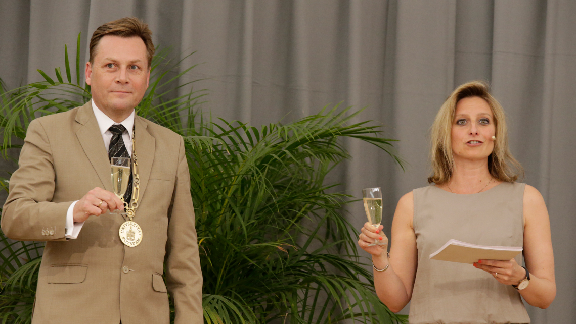 Zahlreiche Gäste aus Politik, Kultur und Wirtschaft, aber auch viele Freunde und Angehörige kamen zum Fstakt, um den erfolgreichen Abschluss dieser wichtigen Lebensetappe gemeinsam mit den Absolventen zu feiern. „Wir hoffen, unsere Studierenden haben an der Universität nicht nur Wissen vermittelt bekommen, sondern auch Bildung und Werte. Denn das ist heute vielleicht eine der wichtigsten Aufgaben der modernen Universität“, sagte der Präsident der Universität, Prof. Oliver Günther, Ph.D. Neben Oliver Günther nutzte auch Potsdams Oberbürgermeister Mike Schubert die Gelegenheit, den ehemaligen Studierenden in einem Grußwort zu ihrem Abschluss zu gratulieren.