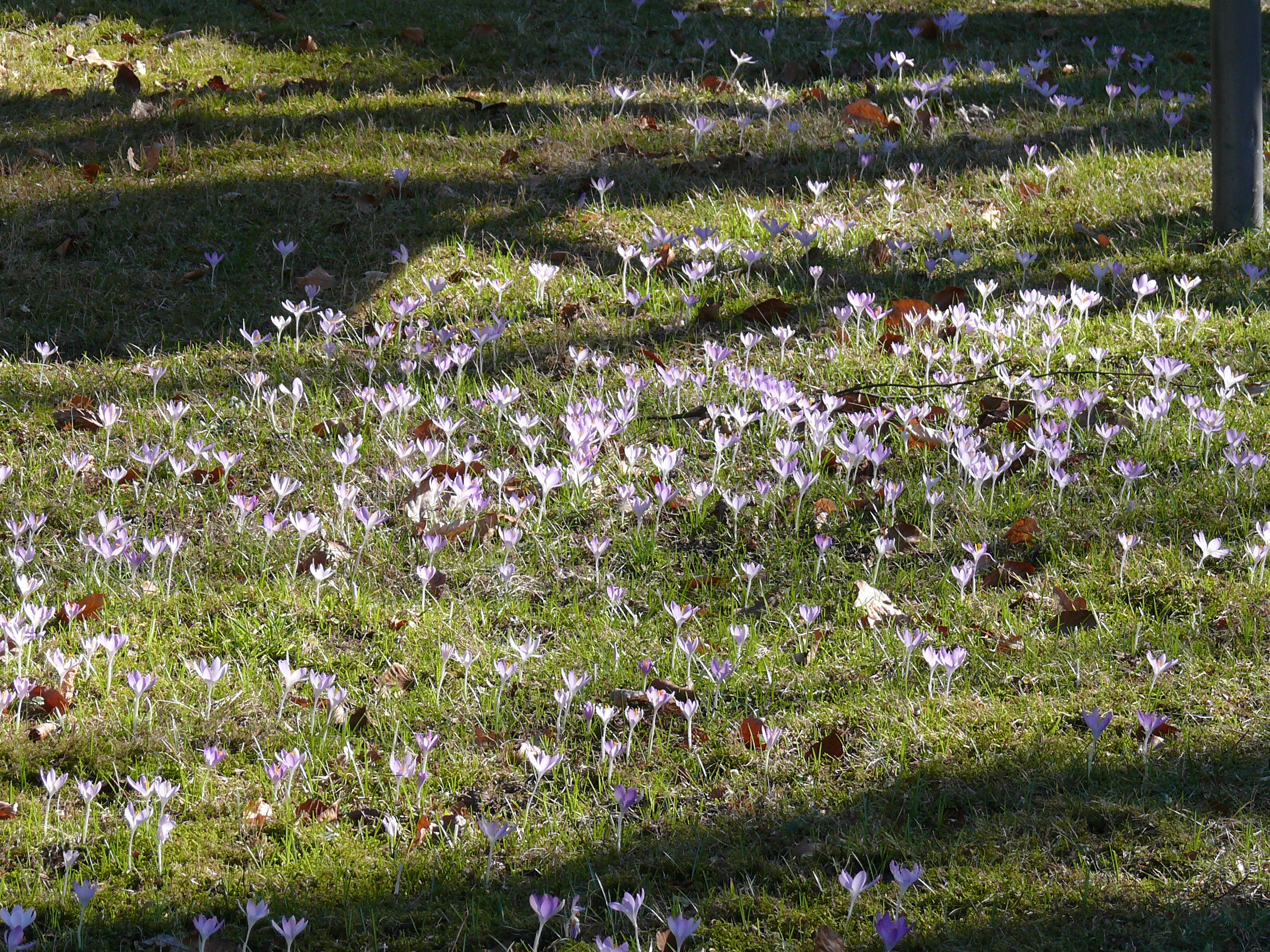 Die Zwiebelblumenwiese schmückt sich von Februar bis Mai mit Blüten, beginnend mit Krokussen (Crocus) und Märzenbecher (Leucojum vernum) bis zu den Kiebitzeiern oder Schachbrettblumen (Fritillaria meleagris). Diese Pflanzen können so früh im Jahr blühen, weil sie in ihren unterirdischen Zwiebeln oder Knollen Reservestoffe des vorgehenden Jahres angehäuft haben.