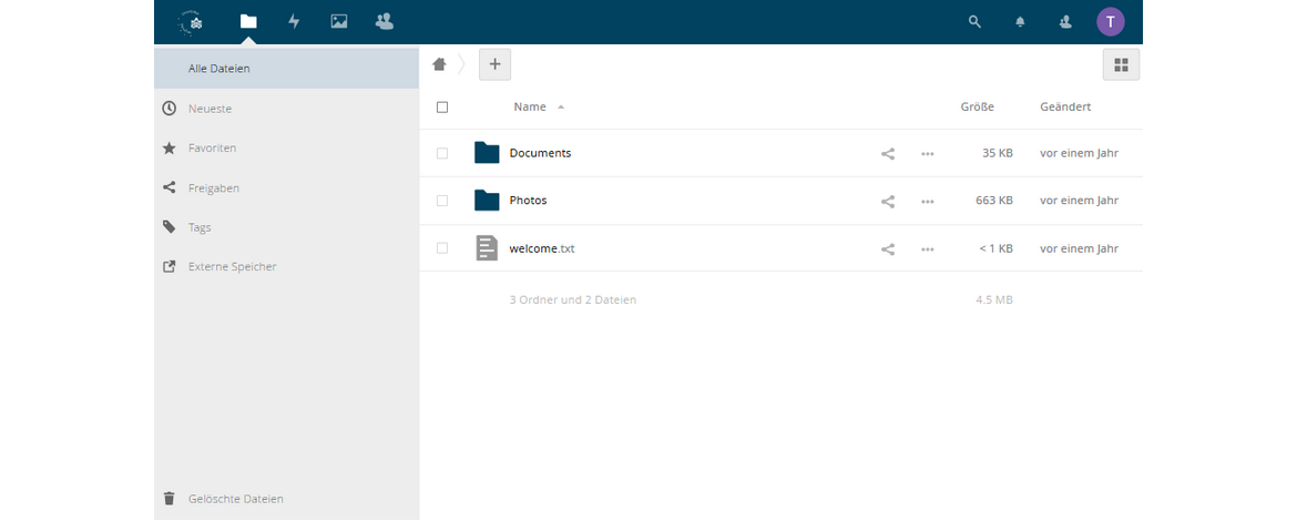 Mit der Dateiübersicht sind alle im Box.UP-Account abgelegten Dateien über die Weboberfläche zu finden und können darüber verwaltet werden. Nach dem ersten Einloggen finden Sie bereits standardmäßig vorhandene Ordner und Beispieldateien. Diese können Sie nach Belieben löschen oder weiternutzen.