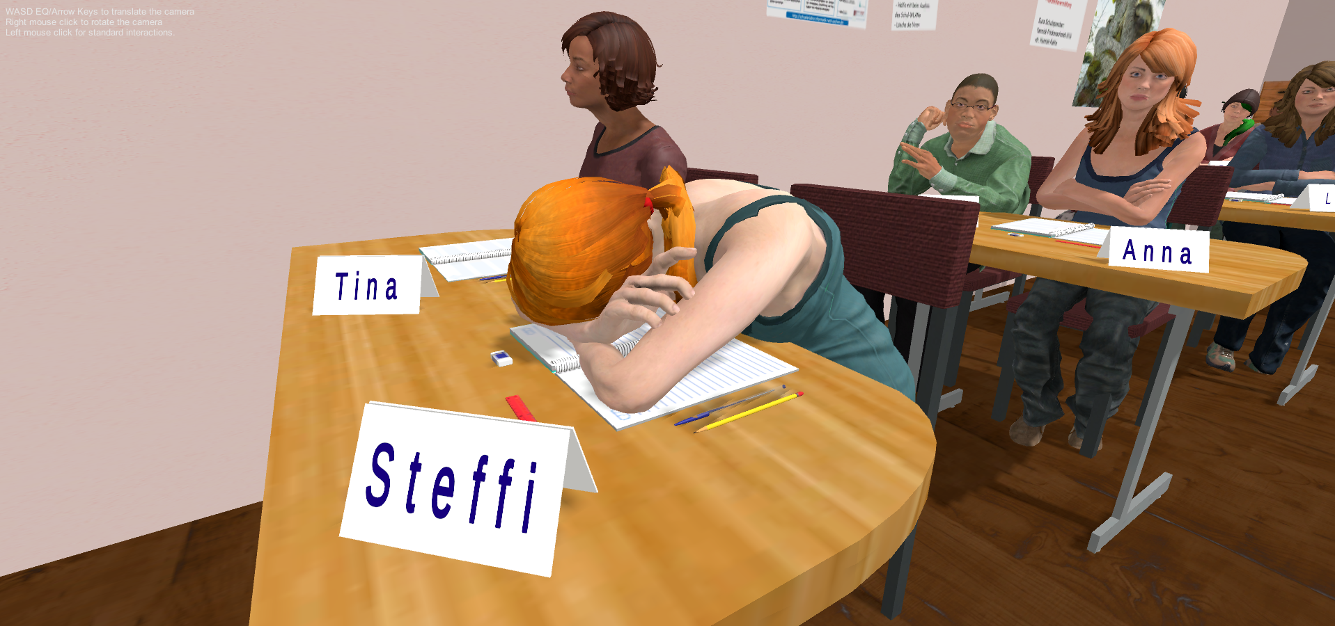Wir an der Universität Potsdam haben ein vollständig immersives VR-Klassenzimmer-System entwickelt, das in der Lage ist, Klassenzimmer sowohl in Bezug auf die Umgebung als auch auf die darin stattfindenden Ereignisse zu simulieren. Dieses System wurde entwickelt, um eine authentische Unterrichtserfahrung zu ermöglichen, die mit der eines realen Klassenzimmers vergleichbar ist. Folglich können sich die Lehrkräfte mit ihrem eigenen Körper frei bewegen, Diashow-Präsentationen halten und mit lebensechten Schüler-Avataren interagieren, indem sie schauen (Eye-Tracking), sprechen (Spracherkennung) und sich bewegen (Bewegungserkennung) (siehe Wiepke et al., 2019 für Beschreibungen des Prototyps).