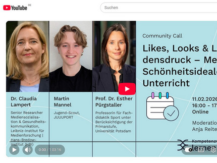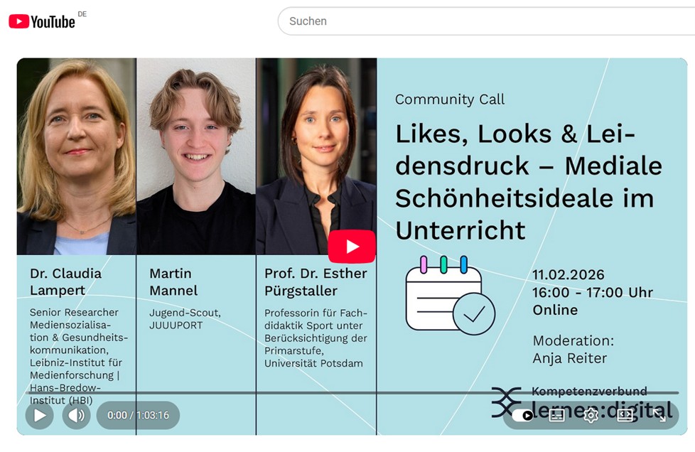 Von #skinnytok bis #looksmaxxing – Körperbilder und Schönheitsideale auf Social-Media-Plattformen prägen die Lebensrealität von Kindern und Jugendlichen. Neue Trends, Lifestyles, Beauty-Filter und visuelle Vorstellungen davon, wie ein erstrebenswerter Körper aussehen sollte, sind in den Feeds von TikTok und Co. allgegenwärtig. Welche schädlichen Folgen können vermeintliche Schönheitsideale für Kinder und Jugendliche haben? Wie kann der kritische Umgang mit Social-Media-Trends in der Schule gefördert werden? Wie können Lehrkräfte Aufklärungsarbeit leisten und für Risiken sensibilisieren? Diese Fragen beantworteten Dr. Claudia Lampert vom Leibnitz-Institut für Medienforschung Hand-Bredow Institut, Hamburg, Martin Mannel, Jugend-Scout bei JUUPORT und Prof. Dr. Esther Pürgstaller im einstündigen Community Call vom Kompetenzverbund lernen:digital zum Thema „Likes, Looks & Leidensdruck – Mediale Schönheitsideale im Unterricht“ am 11.02.2026.