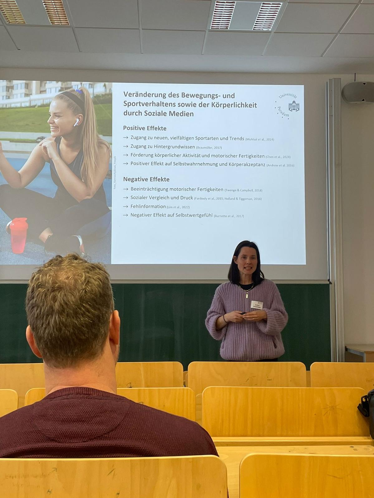 Prof.in Dr. Esther Pürgstaller (Universität Potsdam) hielt einen Vortrag über die Auswirkungen von Soziale Medien auf das Sport- und Bewegungsverhalten aus Sicht von Sportlehrkräften. Thematisiert wurden u. a. digitale Körperbilder, ästhetische Praktiken und deren pädagogische Implikationen für Reflexion, Unterrichtsgestaltung und Professionalisierung von Lehrkräften.