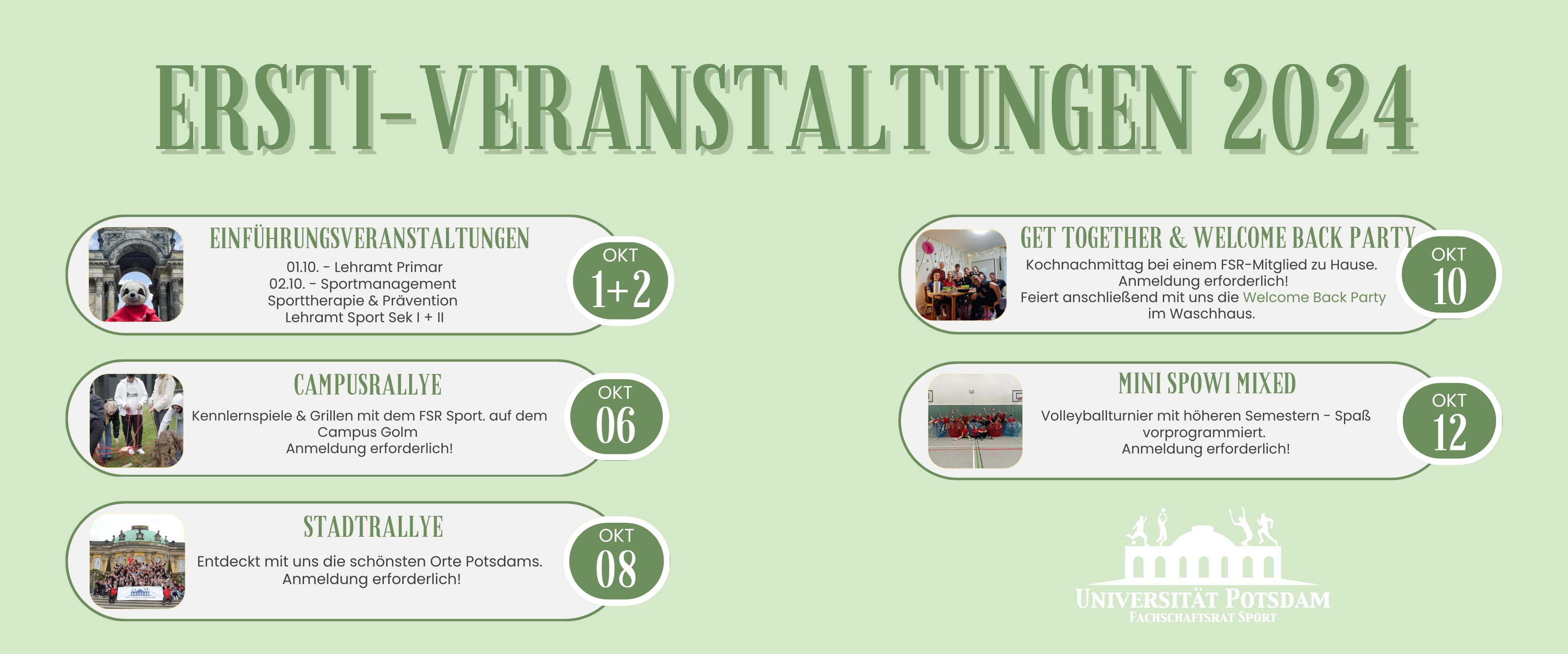 Macht euch bereit für die Ersti-Wochen, in denen wir euch mit spaßigen Events den Start ins Uni-Leben erleichtern möchten. Wir freuen uns darauf, euch an der Universität Potsdam herzlich willkommen zu heißen!