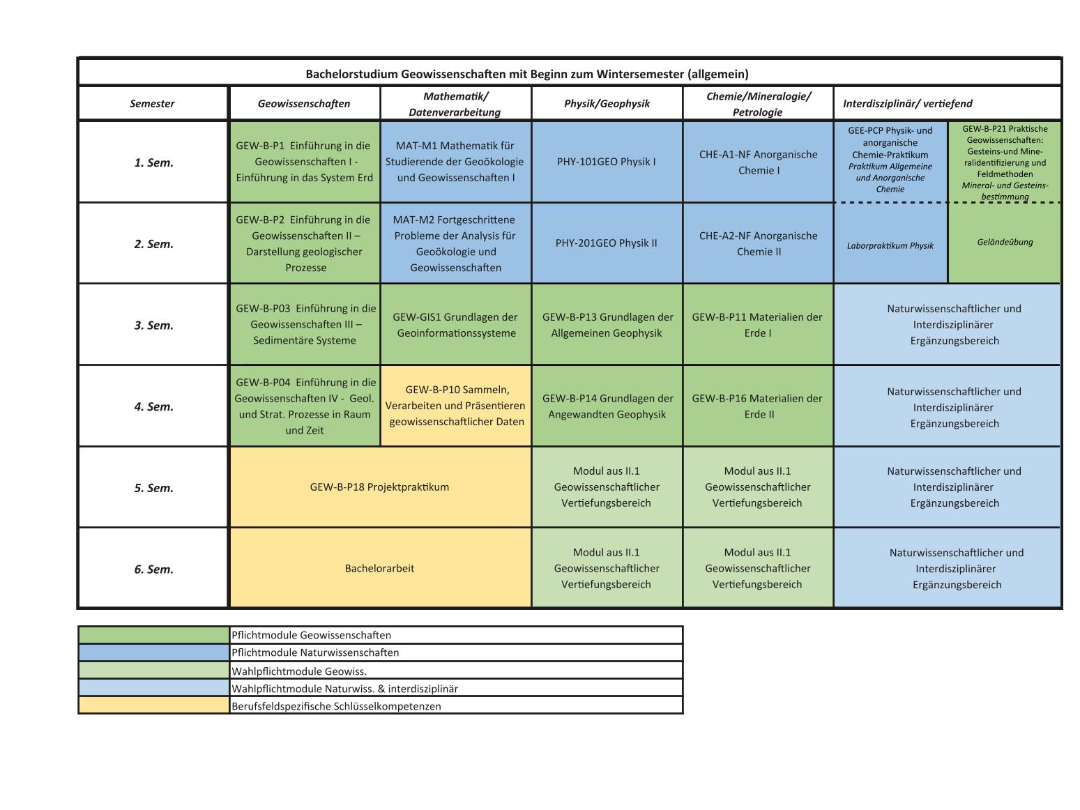 Im zweiten Semester wird dann das zweite Modul der Geowissenschaften angeboten, wobei geologische Prozesse genauer betrachtet werden. In dem dritten und vierten Semester finden dann Module in dem Bereichen Geophysik und Mineralogie statt, dort wird auf das Wissen des ersten beiden Semester aufgebaut. Außerdem werden in den Modulen Geowissenschaften 3 und 4, sedimentäre Systeme und stratigraphische Prozesse behandelt.