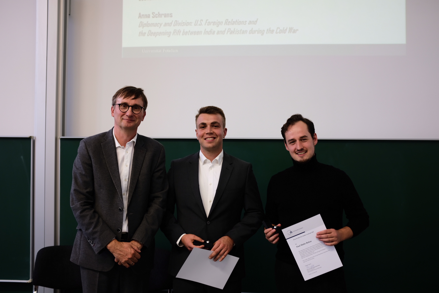Eine besondere Ehrung mit dem Bestpreis, welcher jedes Jahr verliehen wird um die besonderen Leistungen der Studierenden anzuerkennen, erhielten dieses Jahr die Absolventen Paul Behne und Raphael Nicolai aus dem MA War Studies. Der Bestpreis ist mit der Verleihung eines Ehrenrings und einem Preisgeld von 500 EUR verbunden, die beide durch den Förderverein des Lehrstuhls Militärgeschichte gestiftet werden.