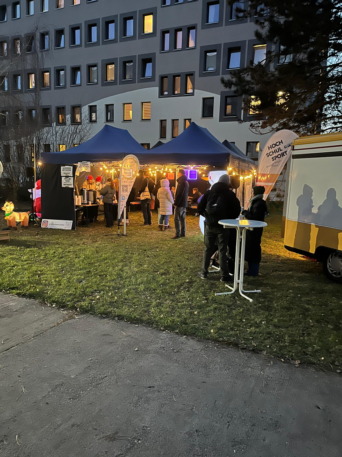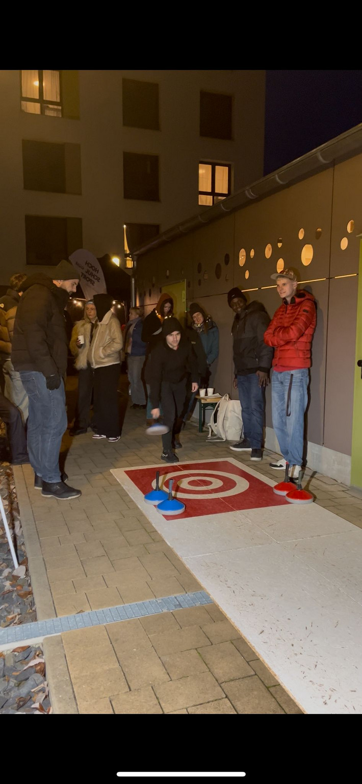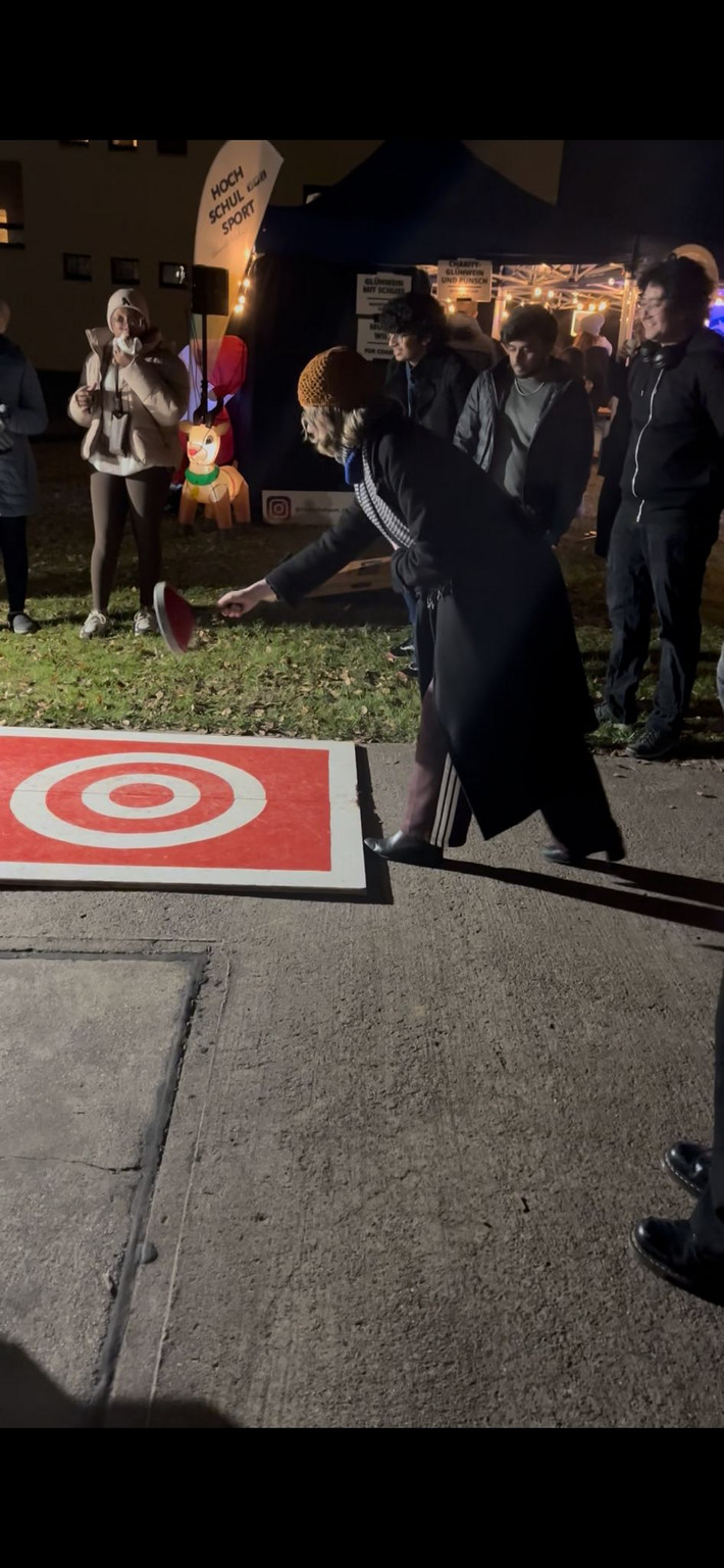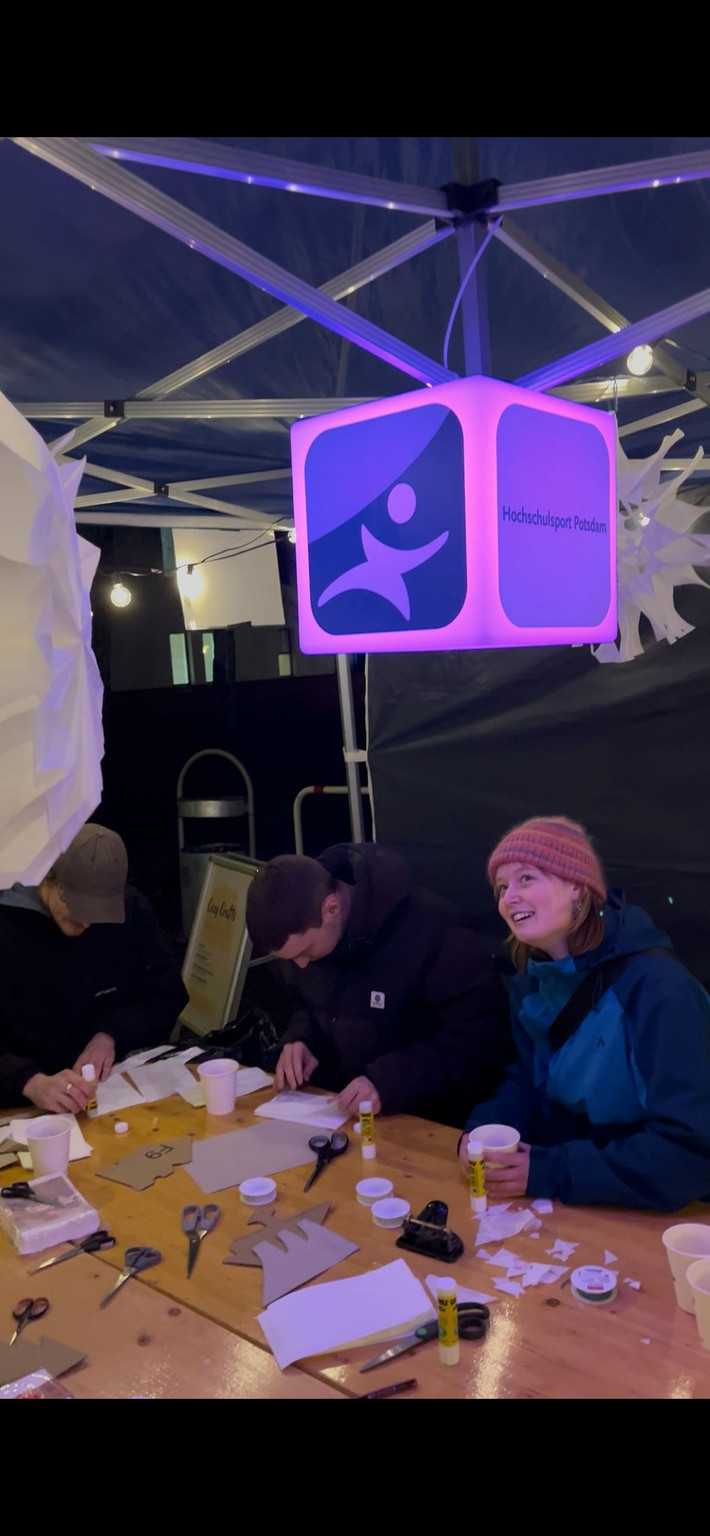 Das Programm war vielfältig und bot für alle Interessen etwas. Sportlich ging es beim Eisstock-Turnier zu, bei dem attraktive Preise auf die Erstplatzierten warteten, darunter Beutel mit Mensa-Gutscheinen und Goodies vom Hochschulsport Potsdam sowie vom Feel Good Campus. Kreativ werden konnten die Teilnehmenden beim Basteln von Kerzengläsern, beim Bemalen von Postkarten oder beim Gestalten von Sternen aus Papiertüten. Ergänzt wurde das Angebot durch ein Quiz mit weiteren Gewinnen wie Intersport-Gutscheinen und zusätzlichen Überraschungen vom Hochschulsport und Feel Good Campus. Für ausgelassene Stimmung sorgten zudem Karaoke, Live-Gesang mit Gitarre.