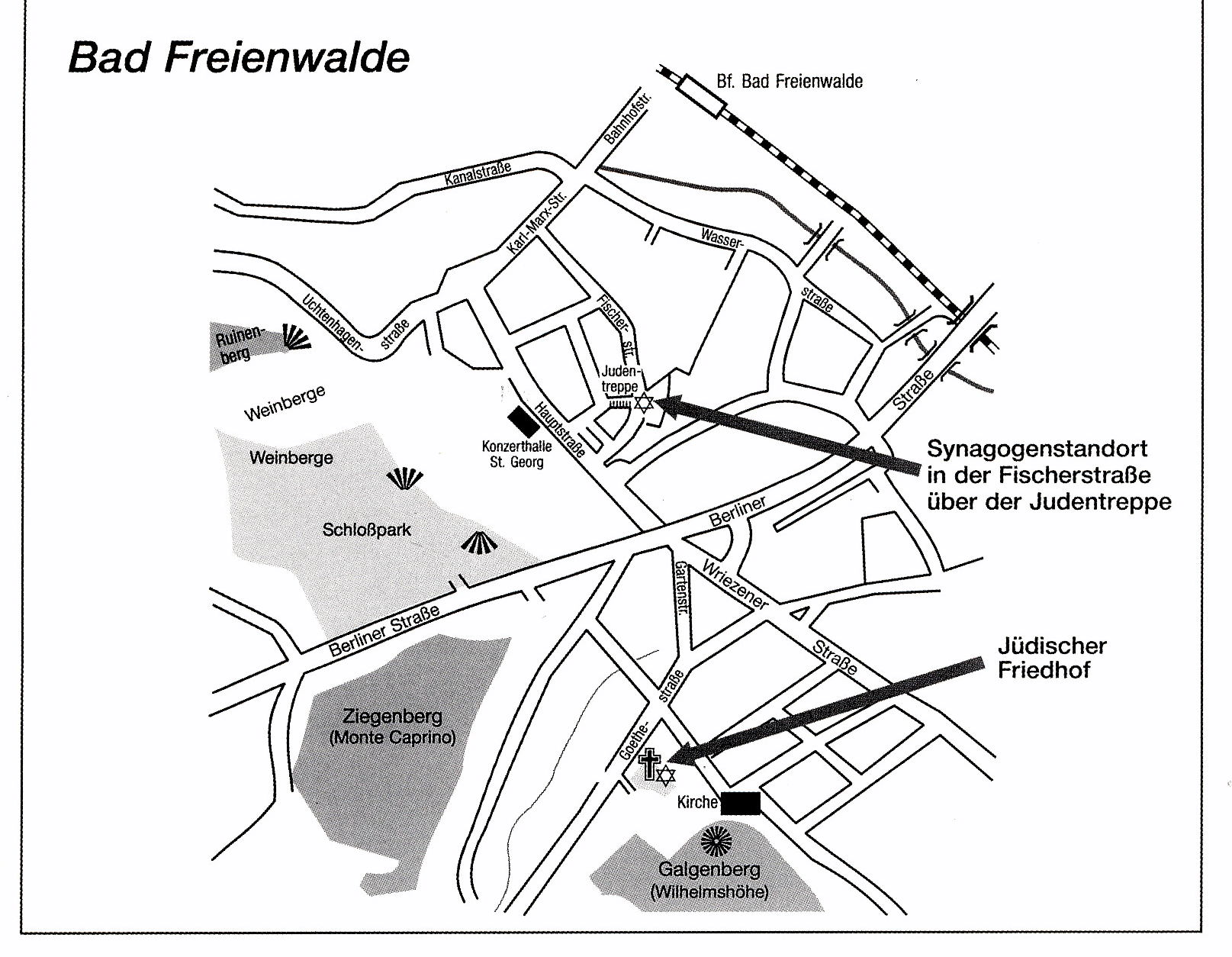 Eine Skizze der Lage des Jüdischen Friedhofs in Bad Freienwalde ist hier zu finden. Veröffentlicht wurde sie von Reinhard Schmook: Bad Freienwalde, in: Wegweiser durch das jüdische Brandenburg, hrsg. von Irene Diekmann, Julius H. Schoeps, Berlin 1995, S. 17. Die Erfassung und Kommentierung der Grabstein-Inschriften erfolgte durch Anke Geißler-Grünberg.