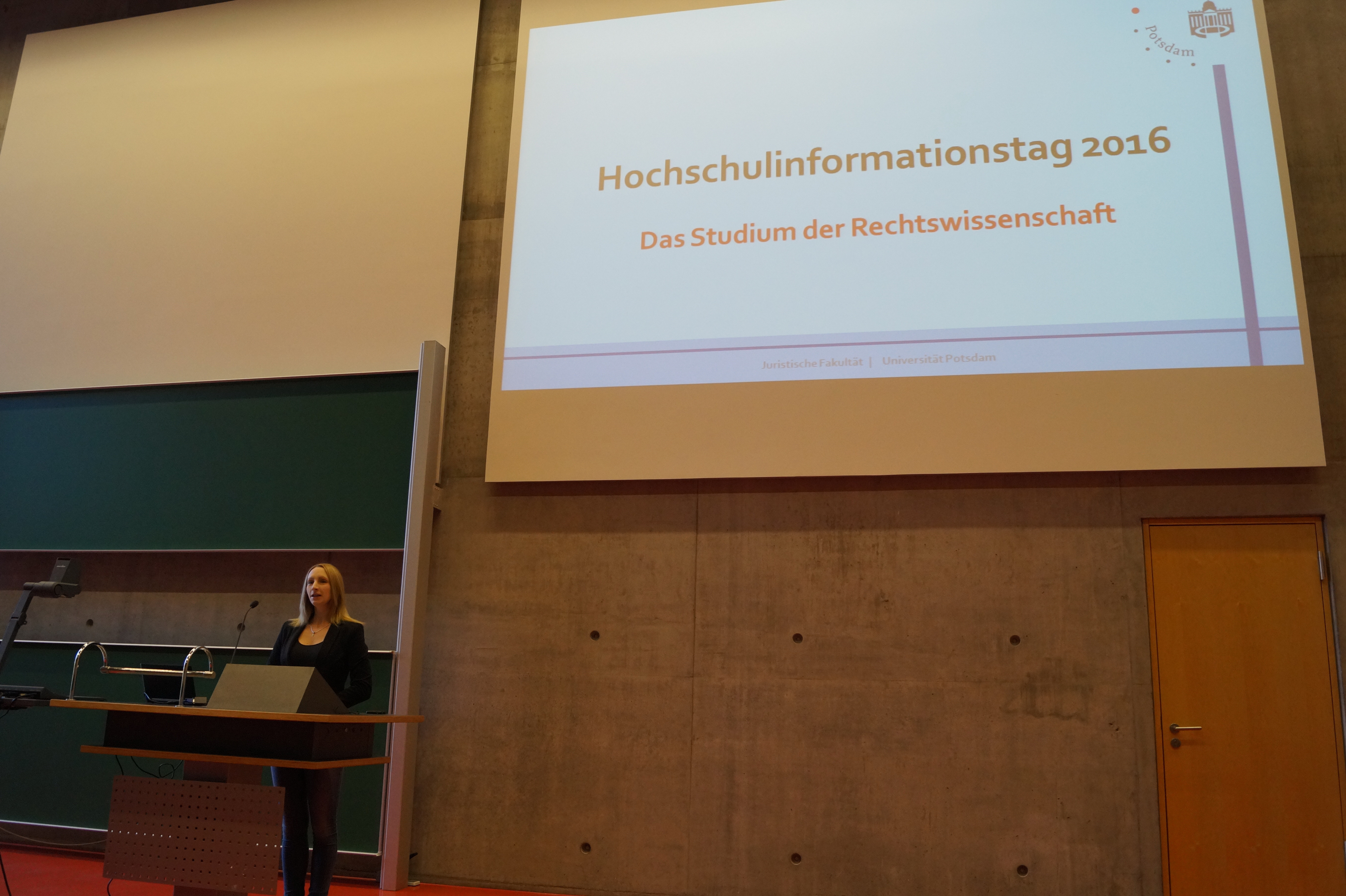 Am 10. Juni 2016 fand an der Universität Potsdam der alljährliche Hochschulinformationstag für Schüler, Abiturienten und Studieninteressierte statt. Im Rahmen einer Informationsveranstaltung der Juristischen Fakultät gab Adda Grauert zunächst einen Überblick zu den rechtswissenschaftlichen Studienangeboten der Fakultät und deren Studienverlauf und -struktur. Anschließend stellte Prof. Dr. Norman Weiß umfassend die Inhalte, Methoden und Perspektiven des Jura-Studiums vor. Im Anschluss an diese Vorträge hatten die Studieninteressierten die Möglichkeit, am Beratungsstand der Fakultät Detailsfragen zu stellen und sich individuell beraten zu lassen. Wir danken insbesondere Beate Stephan, Heike Koernig, Michelle Lechner, Stephanie Krause und Kristian Heise für ihre Unterstützung!