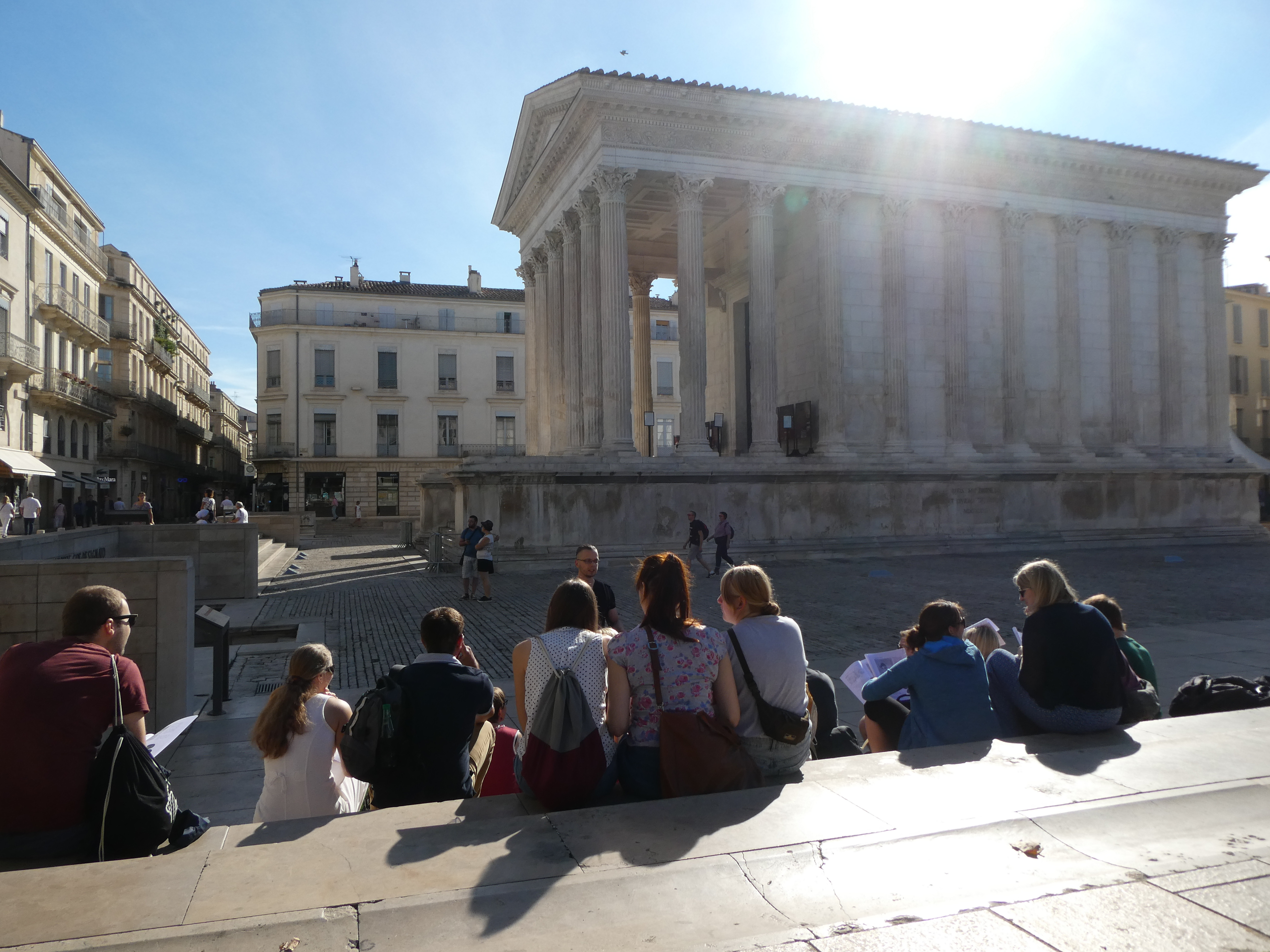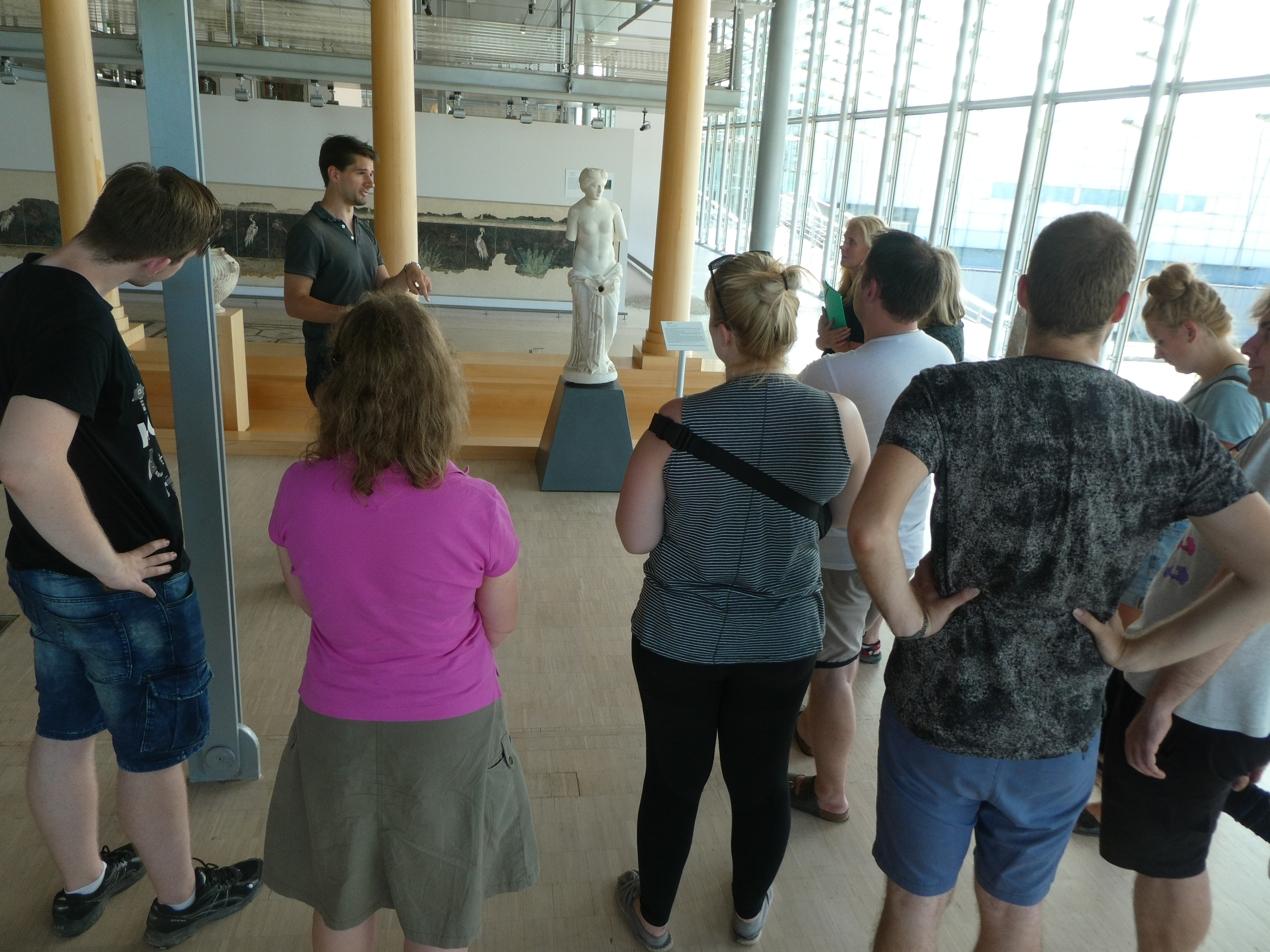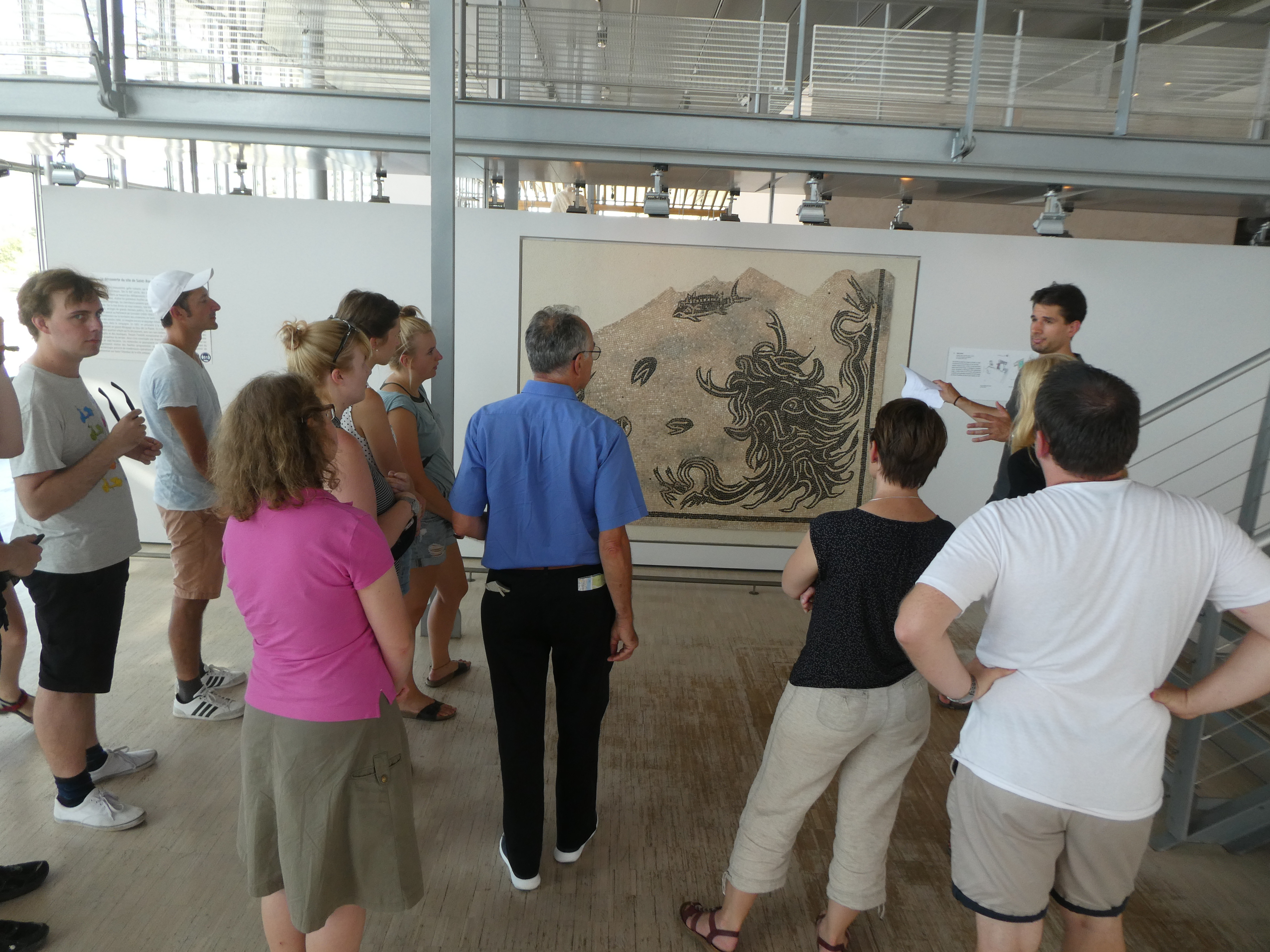 Dieser Tag war ganz der Erkundung des antiken Nîmes gewidmet. Den Auftakt bildete ein Besuch der Maison Carrée, in deren Cella wir einen beeindruckenden Film über die Gründung des römischen Nemausus auf großer Kinoleinwand präsentiert bekamen. Es schlossen sich die Porte d’Auguste, das Wasserkastell, die in ihrem Kern gallische Tour Magne mit herrlichem Ausblick, der Barockpark des Jardin de la Fontaine an der Stelle des antiken Augusteums und der sogenannte Diana-Tempel an, dessen Funktion nicht eindeutig geklärt ist. Nach der Mittagspause besuchten wir das hypermoderne Musée de la Romanité mit seinem Mantel aus weißen Glaspanelen direkt gegenüber dem antiken Amphitheater und konzentrierten uns dort auf ausgewählte Objekte, insbesondere die Mosaiken und die Sonderausstellung zu Gladiatoren.
