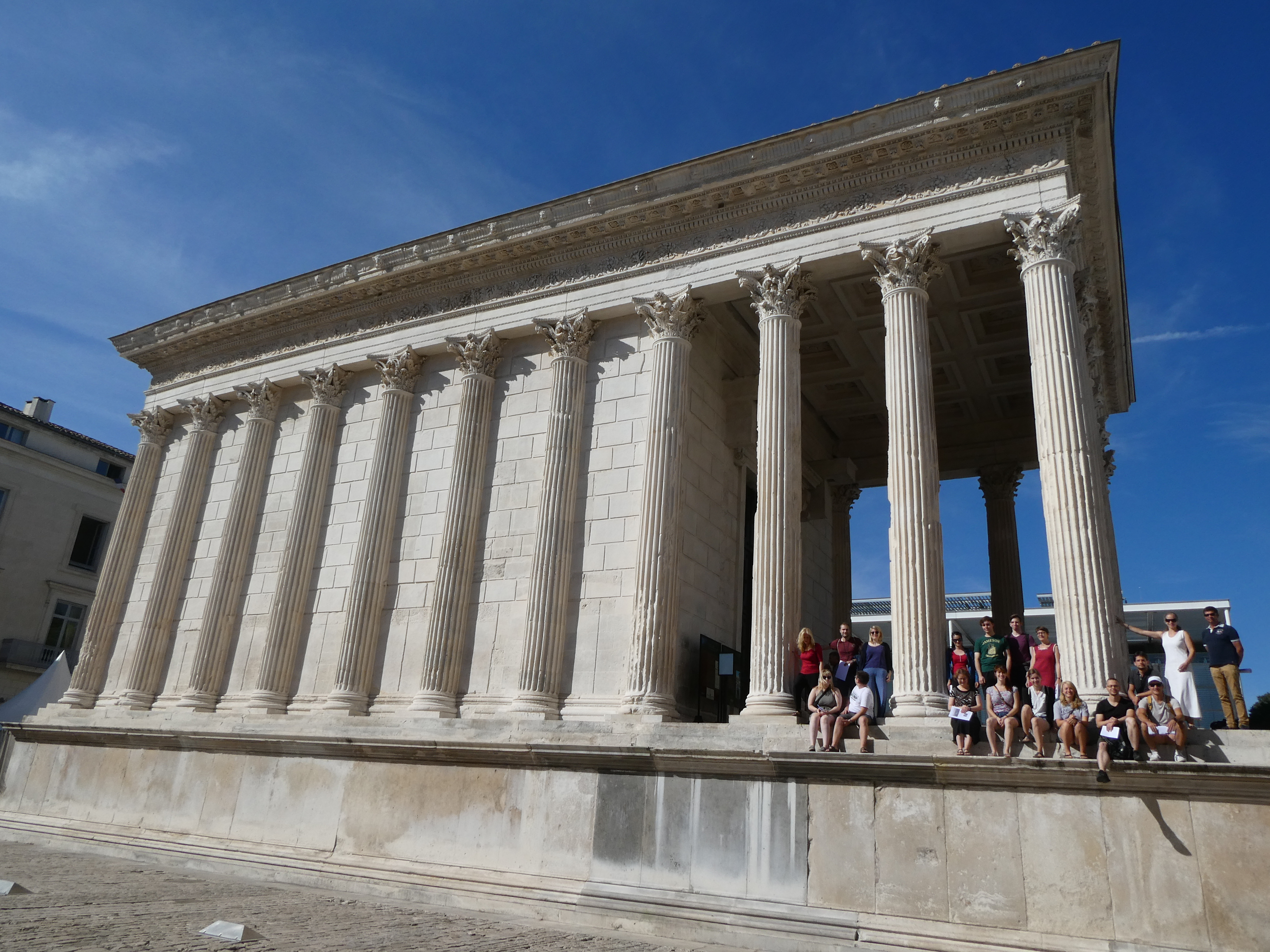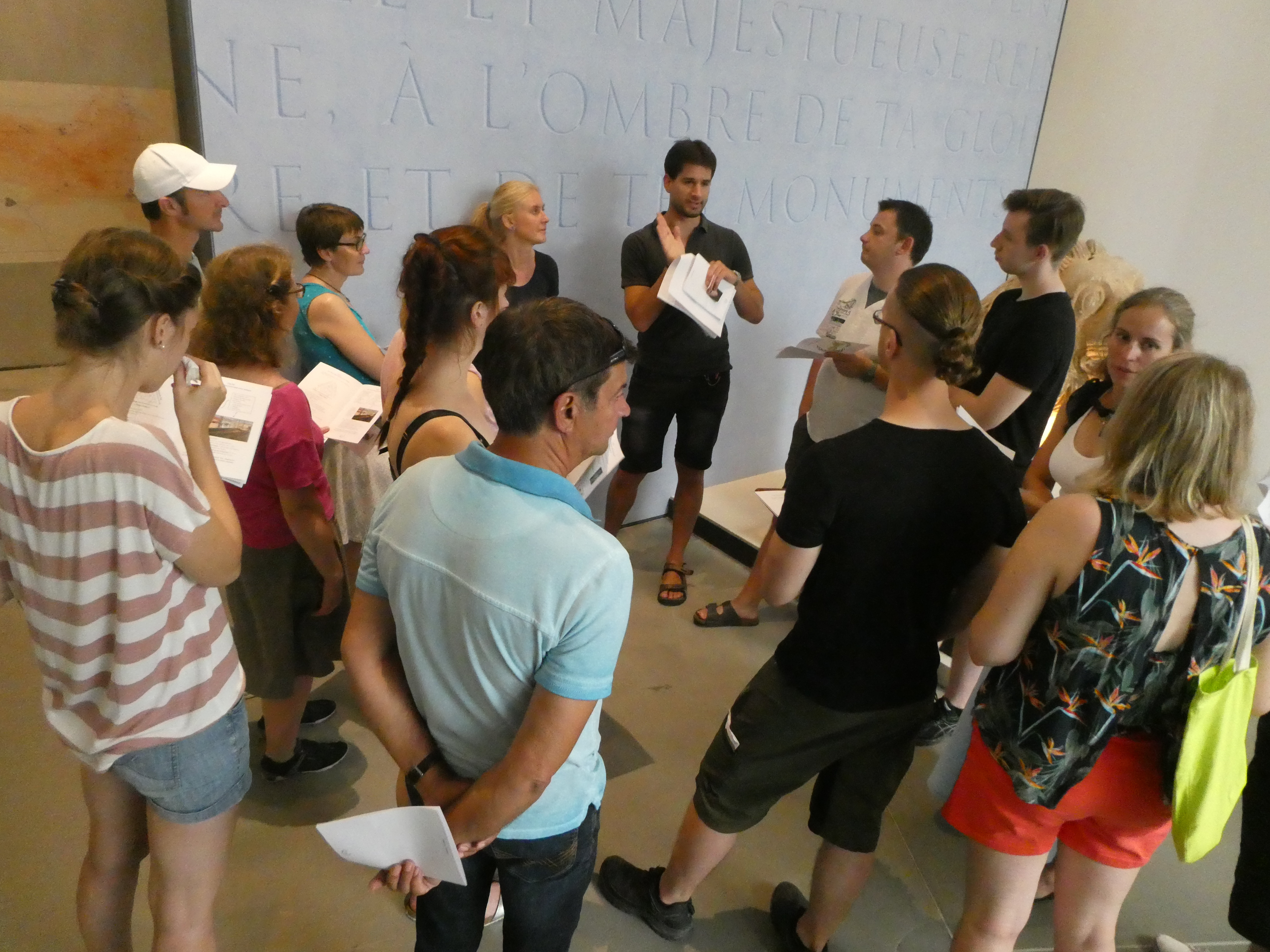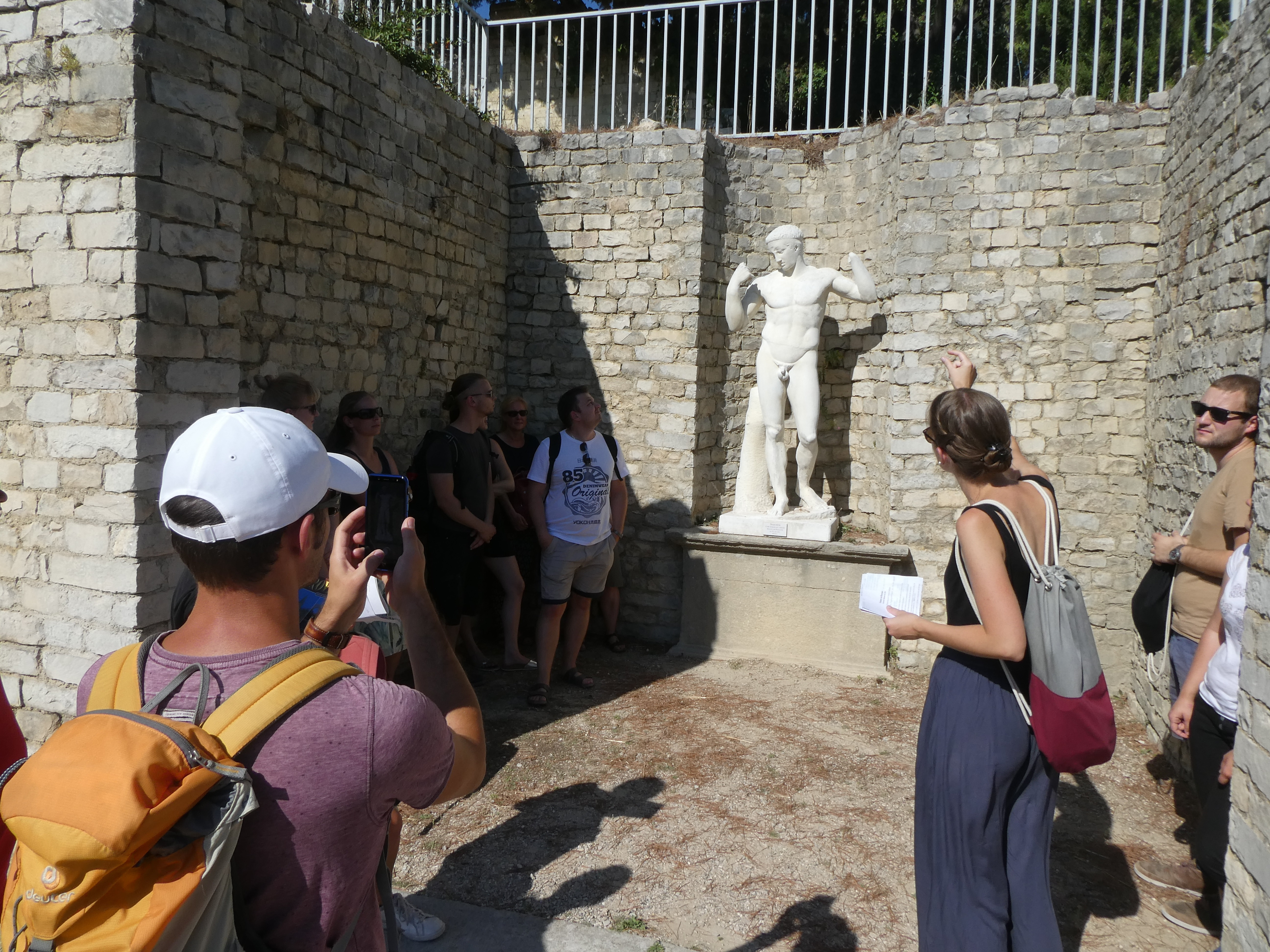 Dieser Tag war ganz der Erkundung des antiken Nîmes gewidmet. Den Auftakt bildete ein Besuch der Maison Carrée, in deren Cella wir einen beeindruckenden Film über die Gründung des römischen Nemausus auf großer Kinoleinwand präsentiert bekamen. Es schlossen sich die Porte d’Auguste, das Wasserkastell, die in ihrem Kern gallische Tour Magne mit herrlichem Ausblick, der Barockpark des Jardin de la Fontaine an der Stelle des antiken Augusteums und der sogenannte Diana-Tempel an, dessen Funktion nicht eindeutig geklärt ist. Nach der Mittagspause besuchten wir das hypermoderne Musée de la Romanité mit seinem Mantel aus weißen Glaspanelen direkt gegenüber dem antiken Amphitheater und konzentrierten uns dort auf ausgewählte Objekte, insbesondere die Mosaiken und die Sonderausstellung zu Gladiatoren.