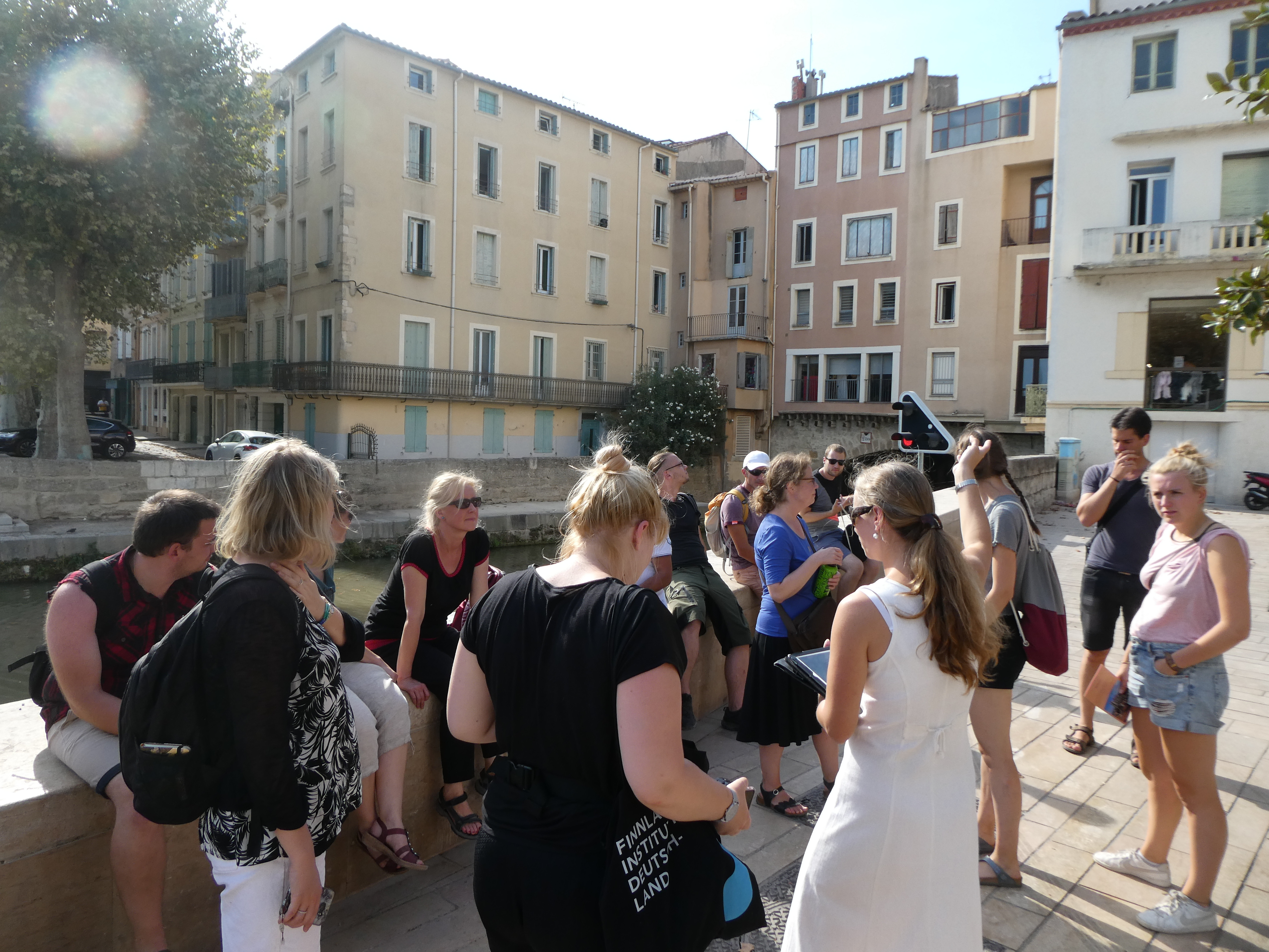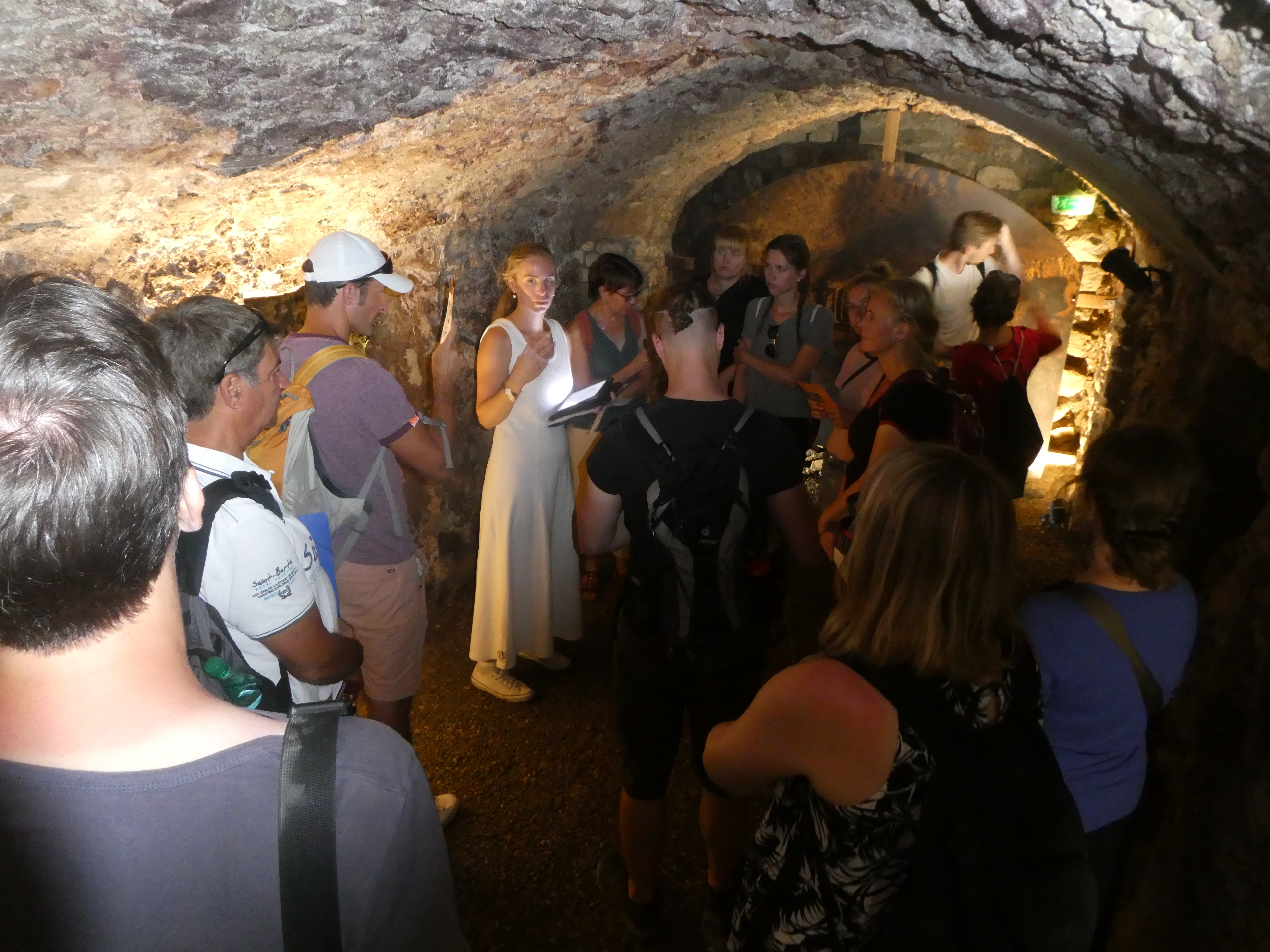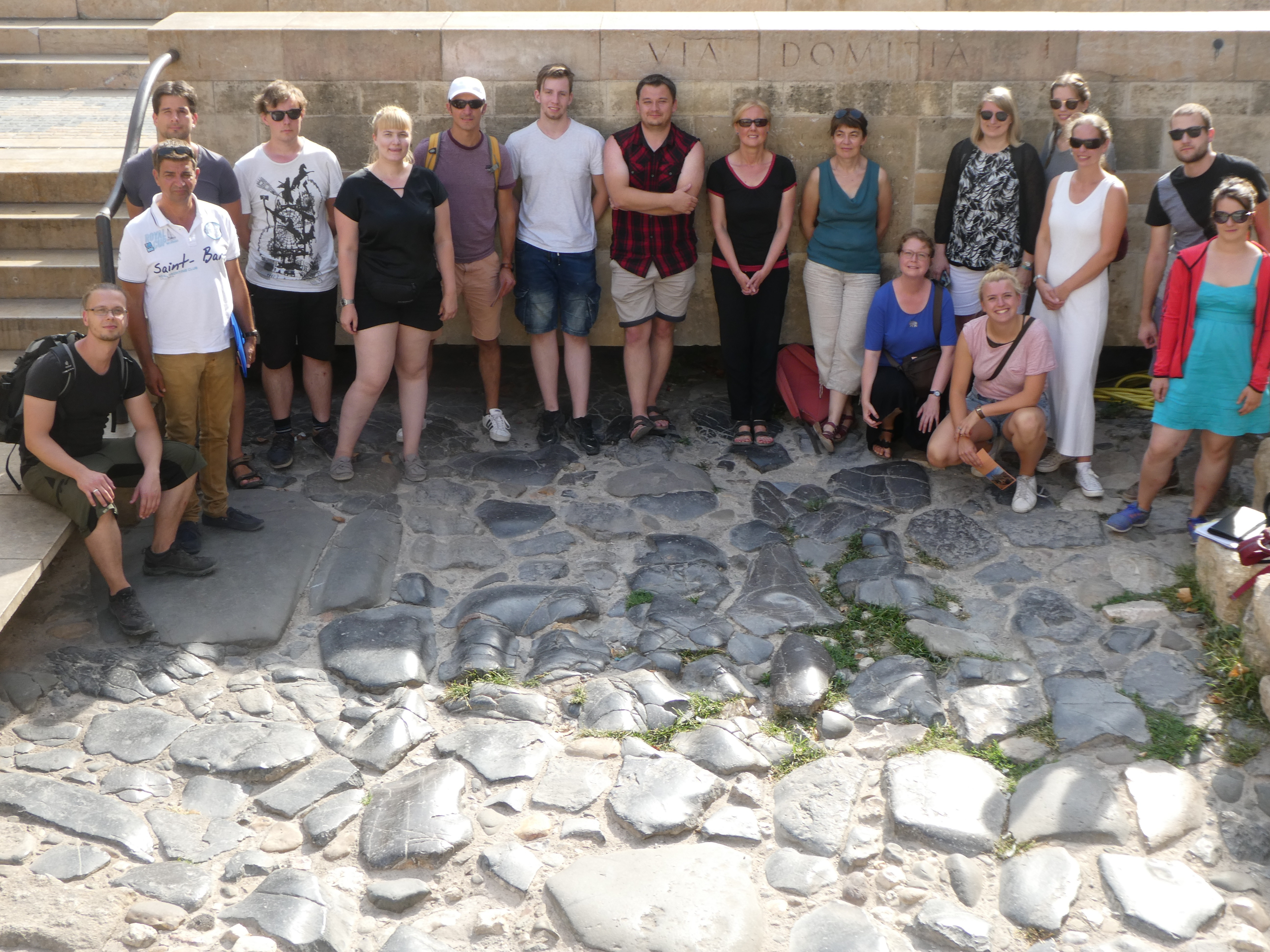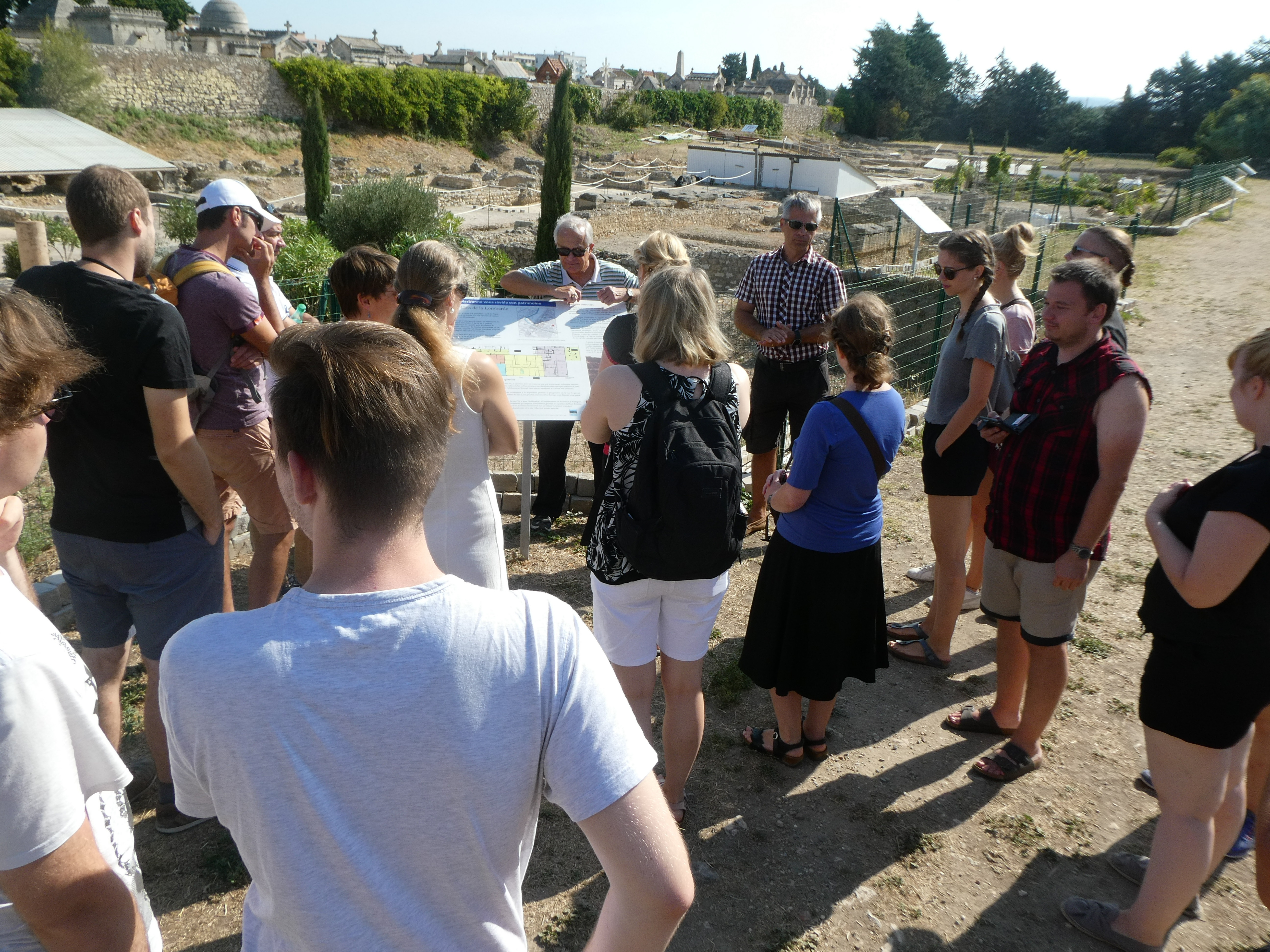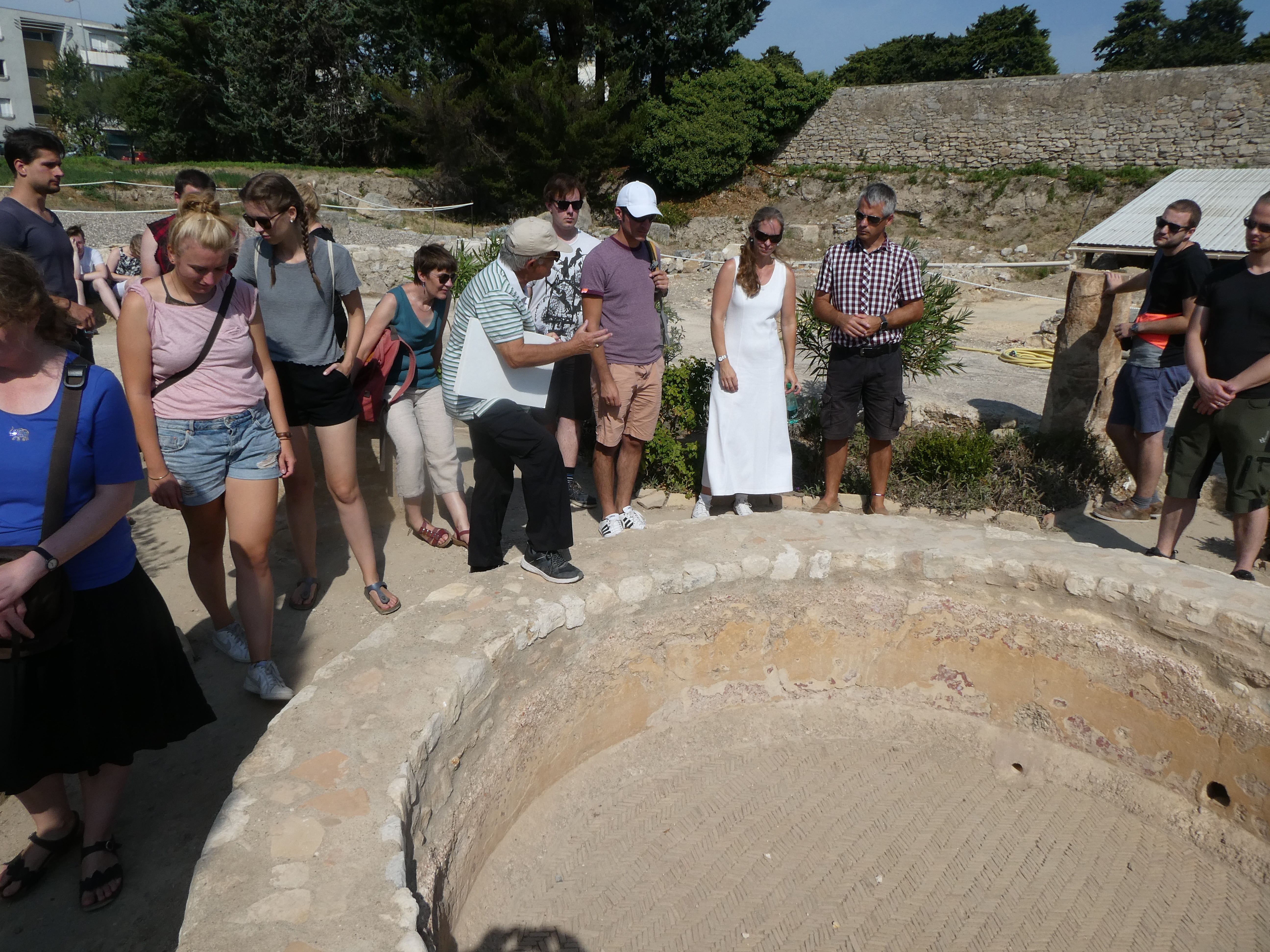 Die ehemalige Hauptstadt der Provinz Gallia Narbonensis, Narbonne, erreichten wir nach längerer Zugfahrt, während derer wir auch einen Blick aufs Mittelmeer erhaschen konnten. In der Ausgrabungsstätte „Le Clos de la Lombarde“ erhielten wir eine sehr ausführliche und engagierte Führung durch M. Schmitt, einen ehrenamtlichen Mitarbeiter des Vereins, dessen Anliegen es ist, die Stätte zu erhalten, für Besucher attraktiv zu gestalten und einer breiteren Öffentlichkeit bekannt zu machen (www.lesamisduclosdelalombarde.fr). Die Wandmalereien und Mosaiken, die aus dem Gelände geborgen wurden, konnten wir leider nicht im Original sehen, da das archäologische Museum wenige Tage zuvor ohne Vorankündigung geschlossen worden war und die Eröffnung des neuen Museums erst im kommenden Jahr erfolgen soll. Nach der Mittagspause besichtigten wir das römische Horreum, ein Labyrinth unterirdischer Galerien, die wahrscheinlich als Speicherräume dienten und in denen vielleicht auch Handel stattfand. Am Ende sahen wir uns Reste der Via Domitia und einer in ihrem Kern römischen Brücke an. Ein Besuch der gotischen Kathedrale und ein Spaziergang in der sehr entspannt wirkenden Innenstadt rundeten diesen Tag ab.