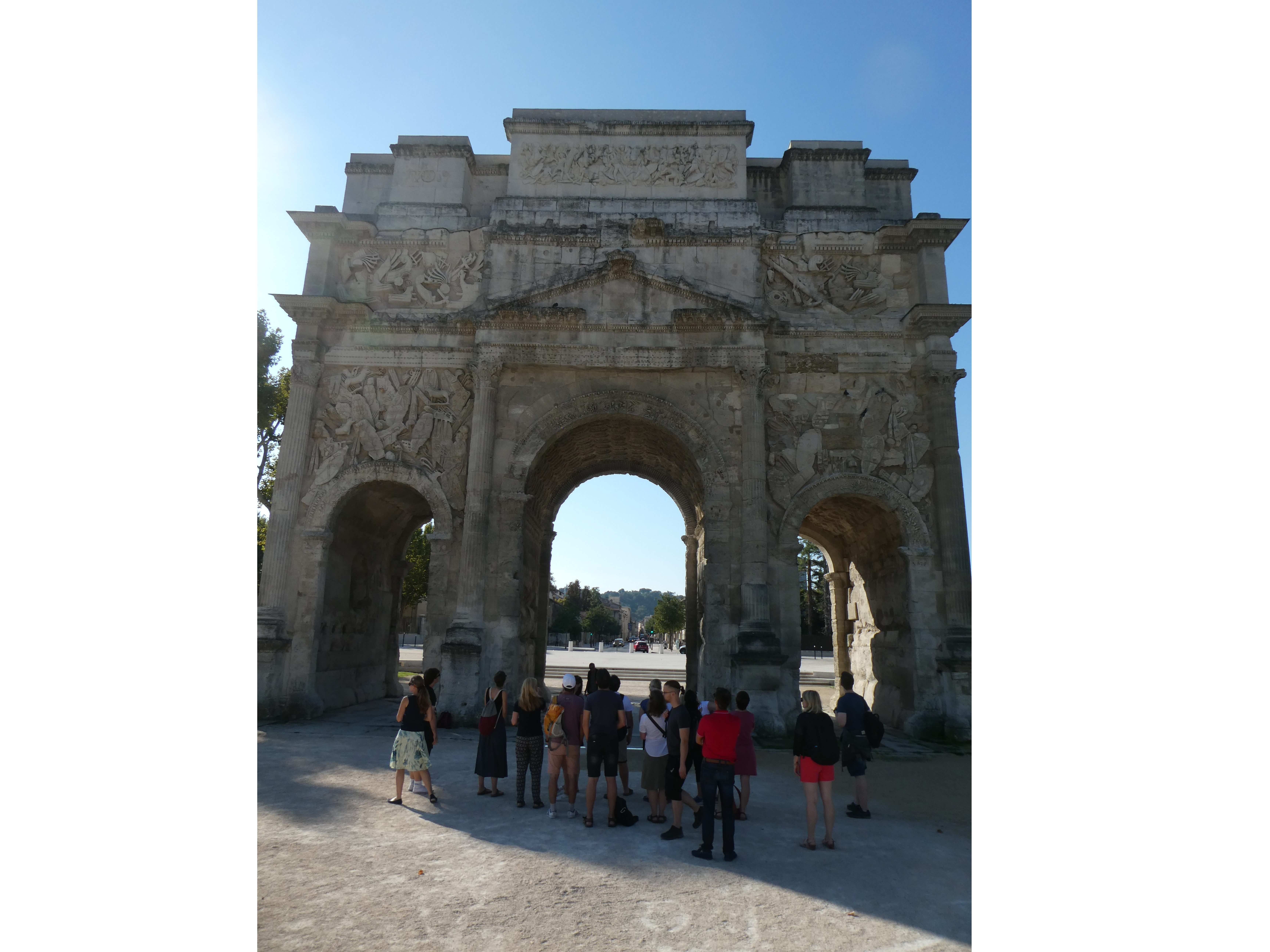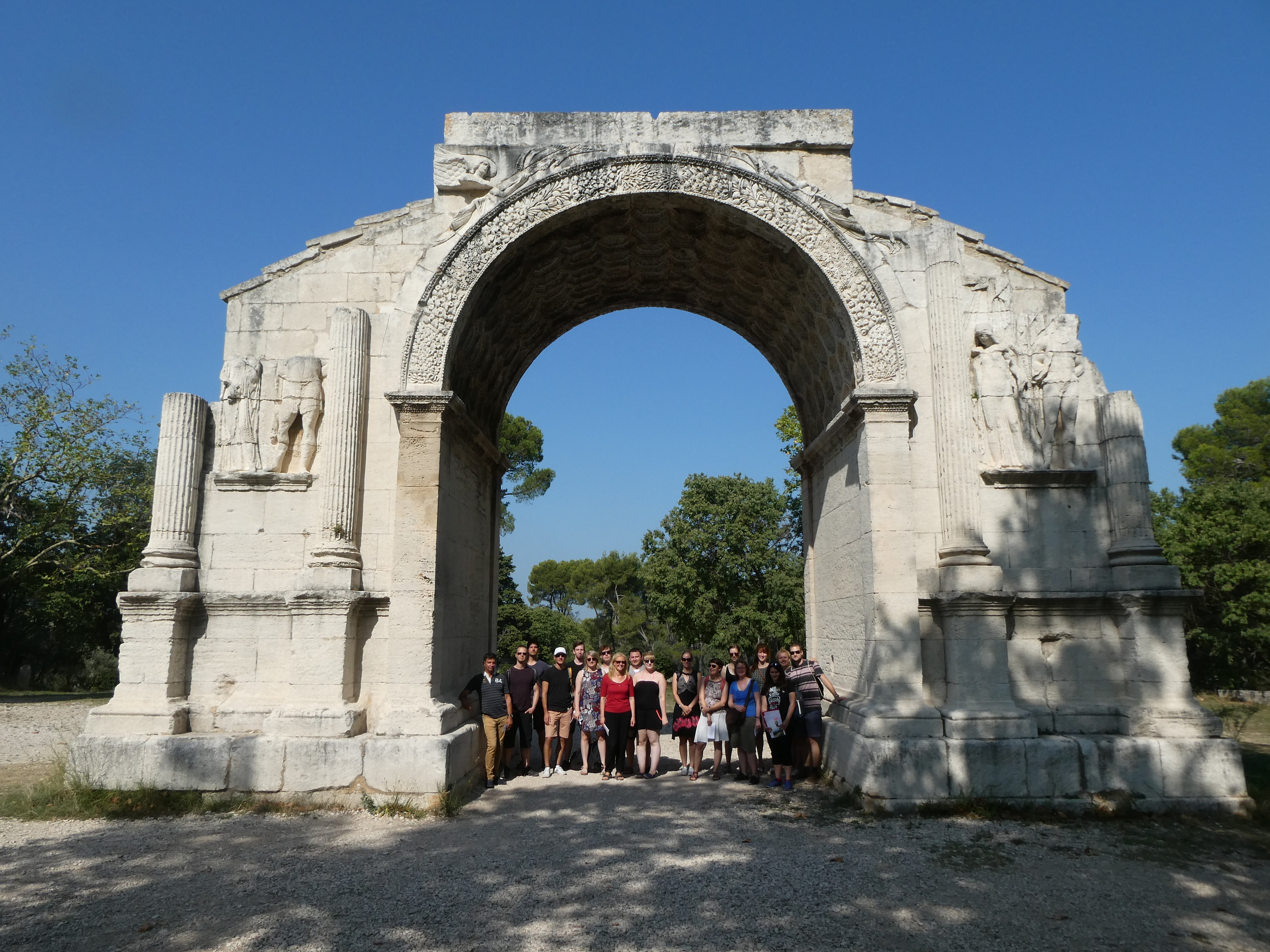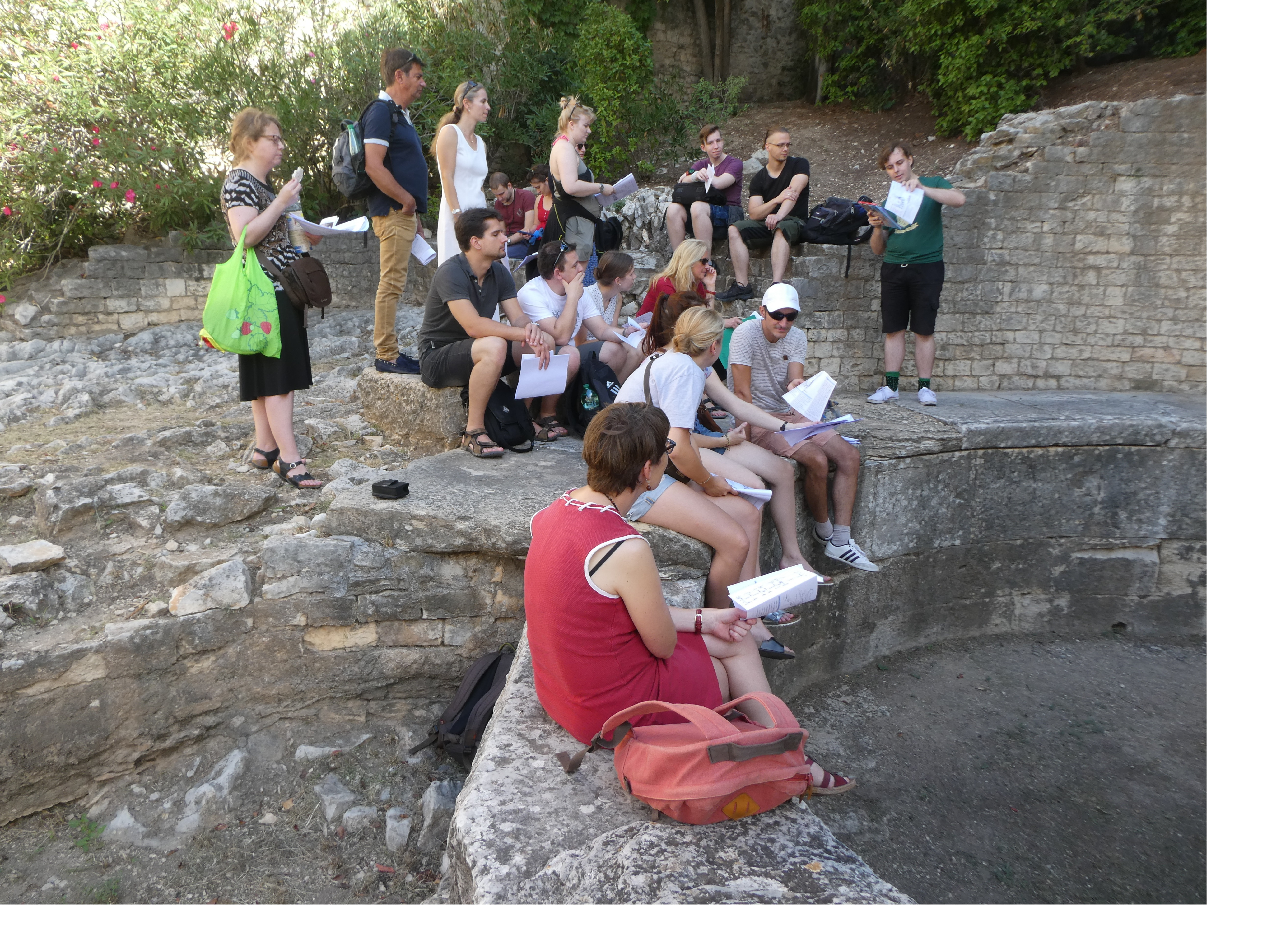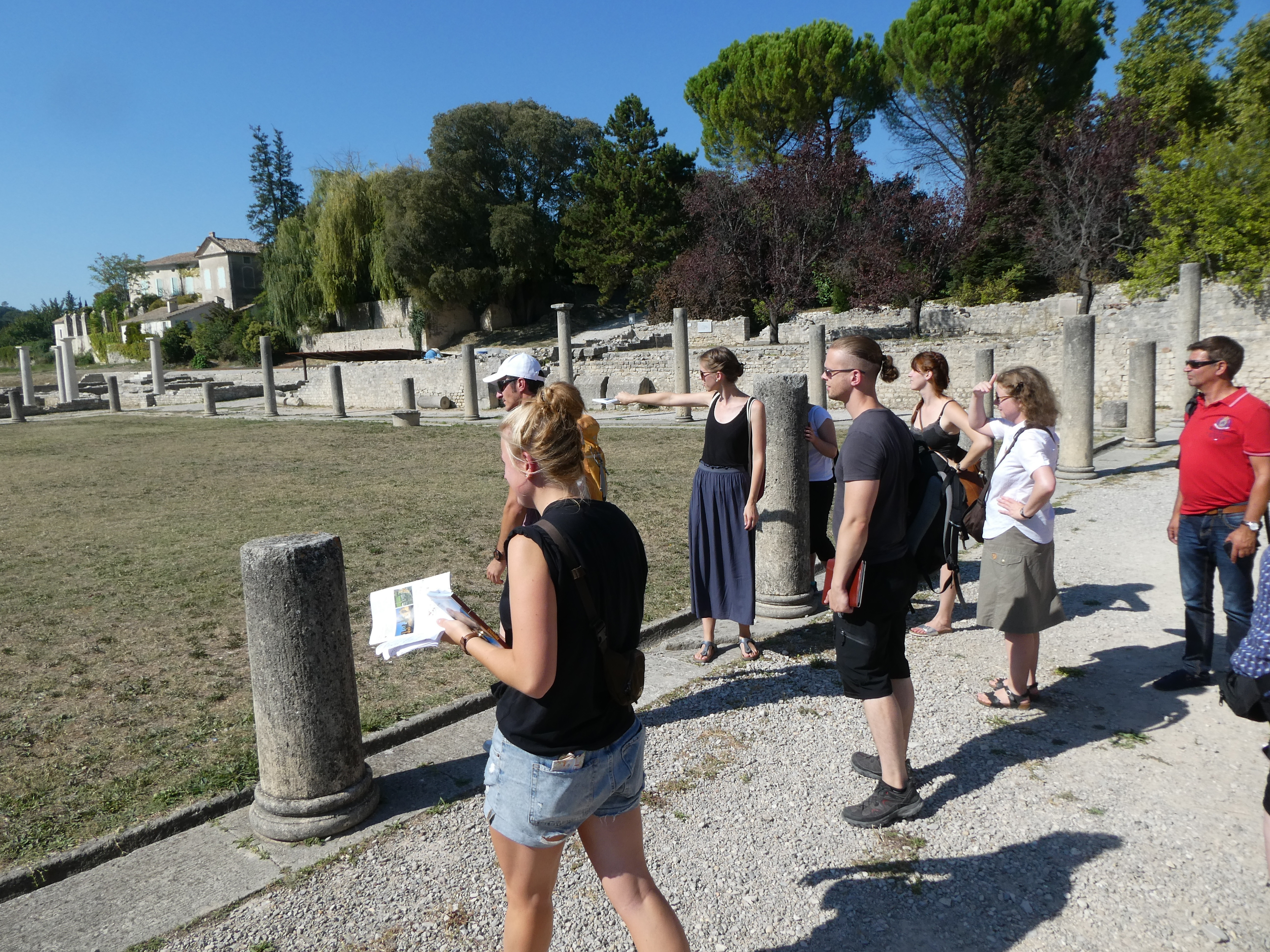 Am siebten Tag besichtigten wir das antike Orange mit Ehrenbogen und sehr gut erhaltenem Theater, in dessen Orchestra drei studentische Grazien in männlicher Begleitung den Kanon „Gaudeamus hodie“ darboten, um uns die gute Akustik vorzuführen. Einige Bruchstücke des Theaters, u.a. Schmuck der Bühnenwand und der Bühne, konnten wir später im kunsthistorischen Museum betrachten. Nach einem Mittagessen im belebten Zentrum der sympathischen Kleinstadt fuhren wir nach Vaison-la-Romaine, wo wir von unseren zwei Führerinnen fachdidaktisch fundiert und mit viel pädagogischem Einfühlungsvermögen durch zwei Ausgrabungsgelände und das Antikenmuseum geleitet wurden; den Abschluss des Tages bildete die Römerbrücke. Ein fröhliches Beisammensein in der Jugendherberge bei selbst mitgebrachten und gekochten Speisen stimmte uns auf den sich langsam nähernden Abschied ein.