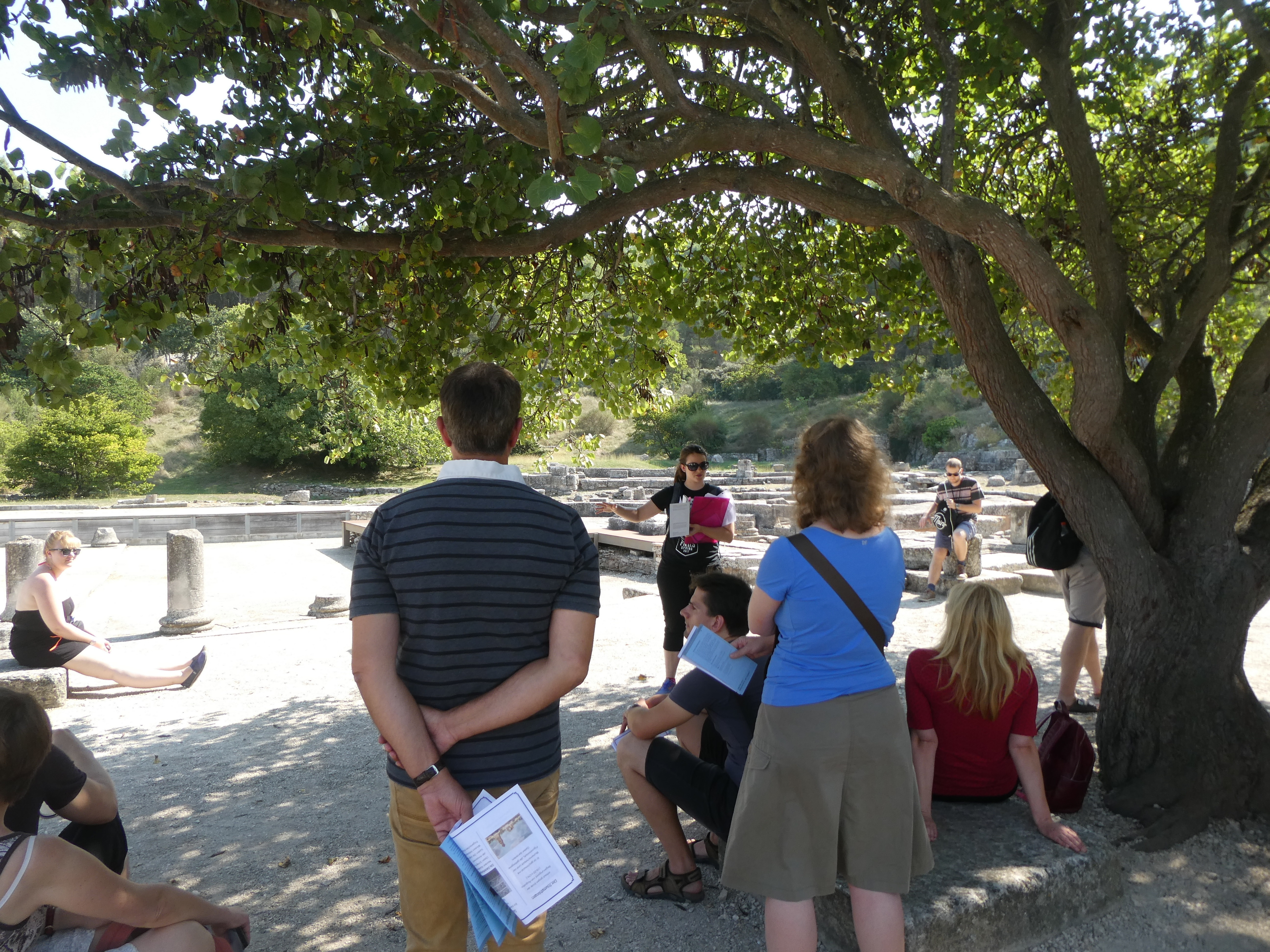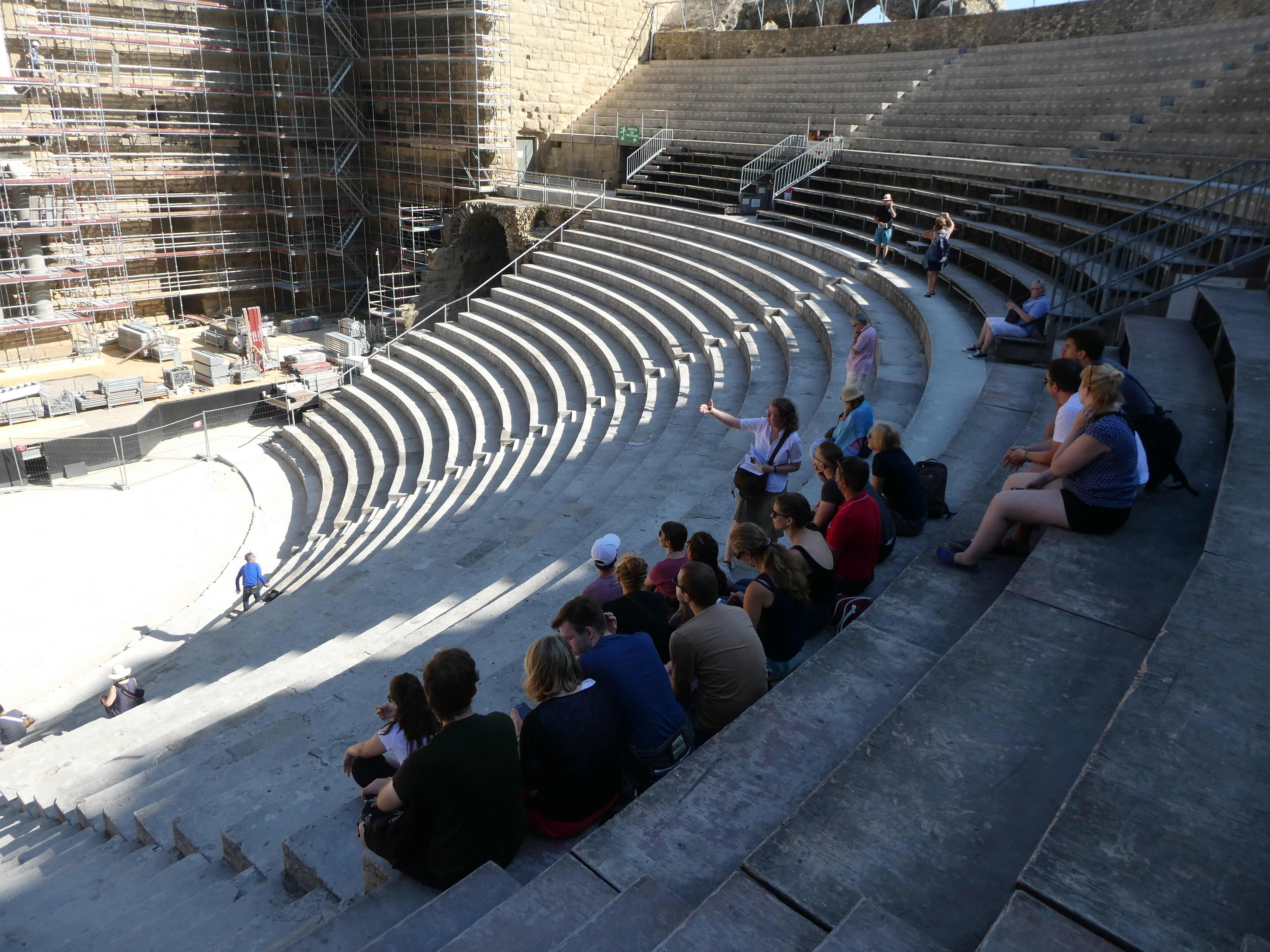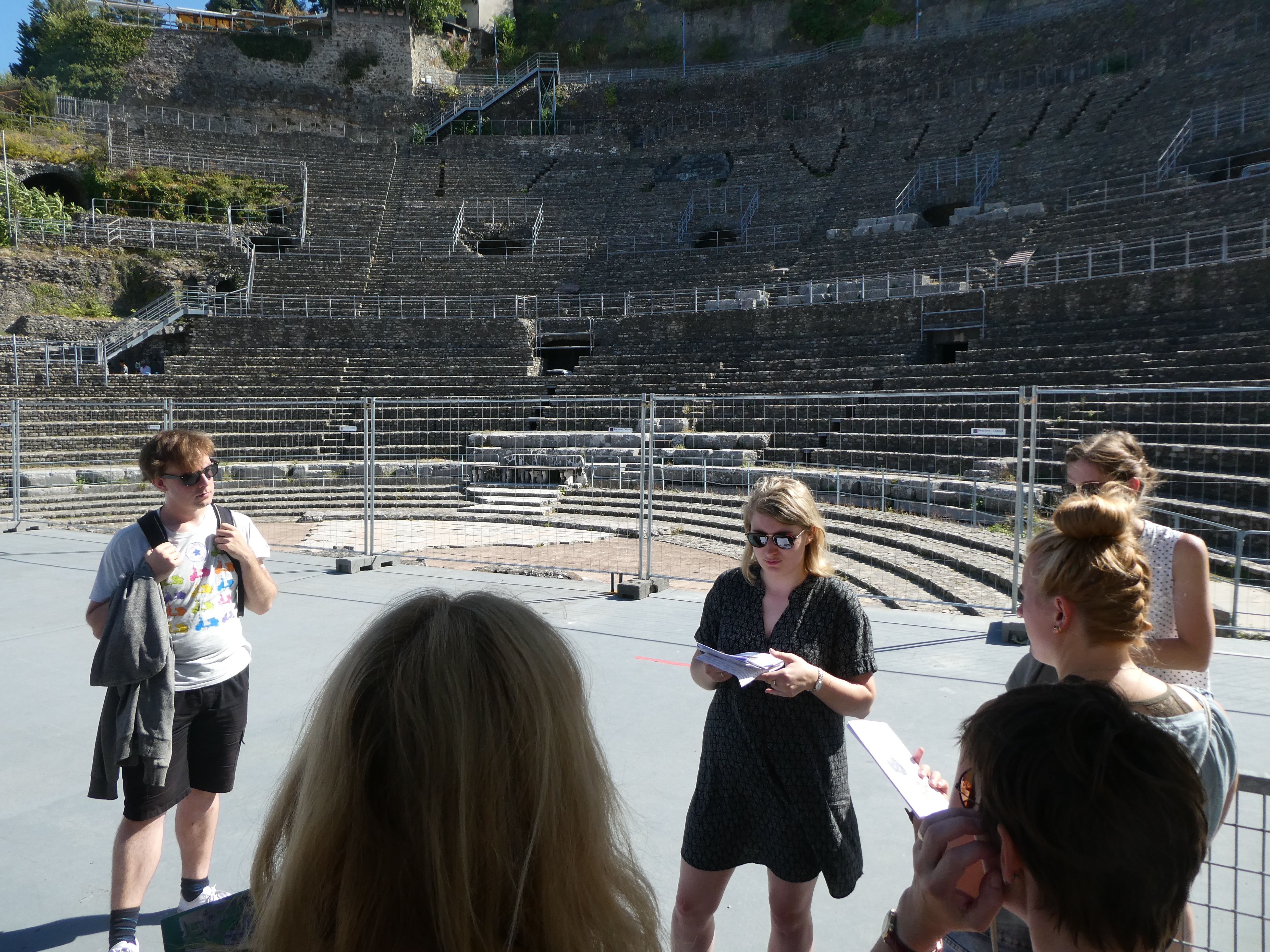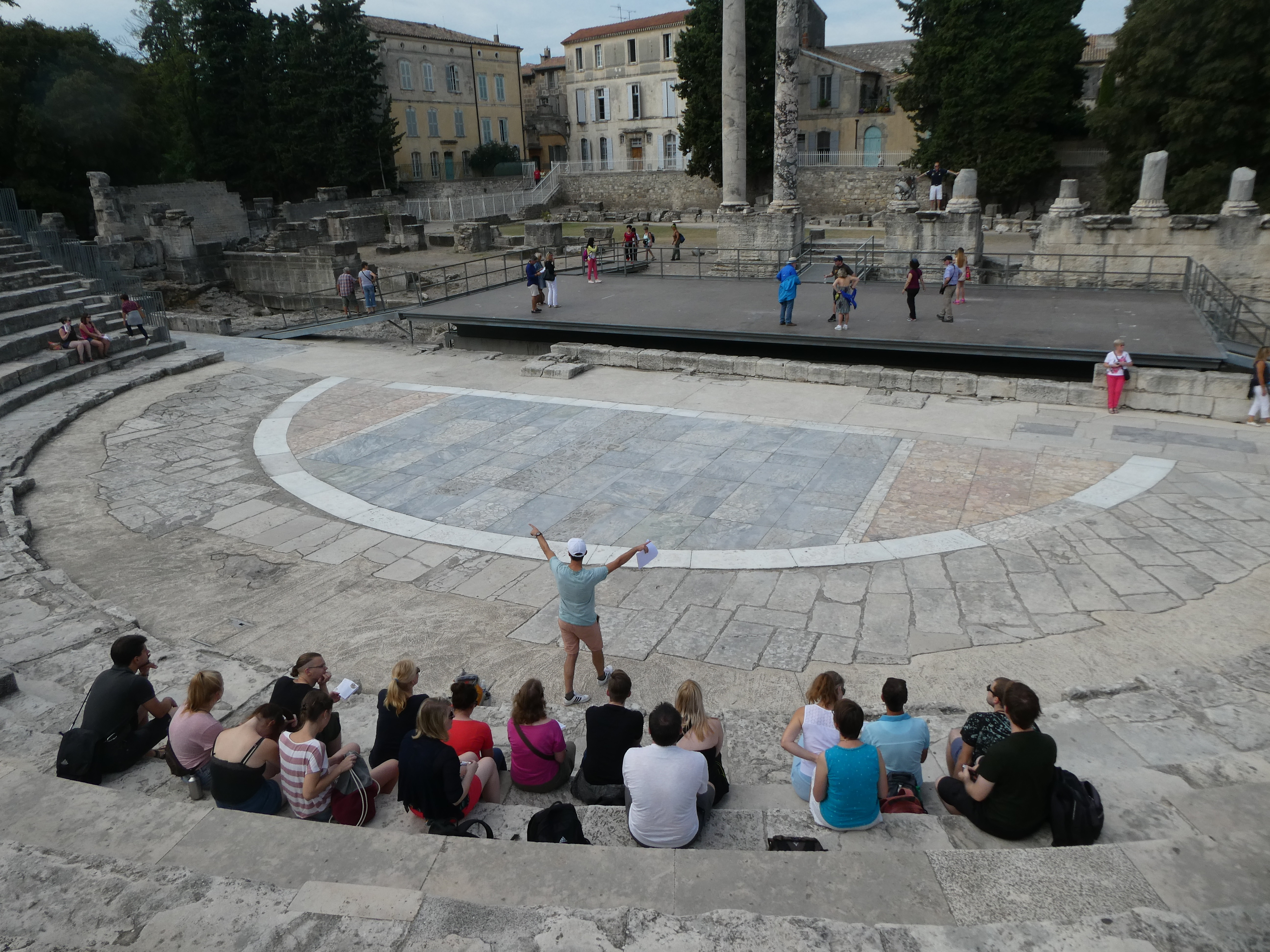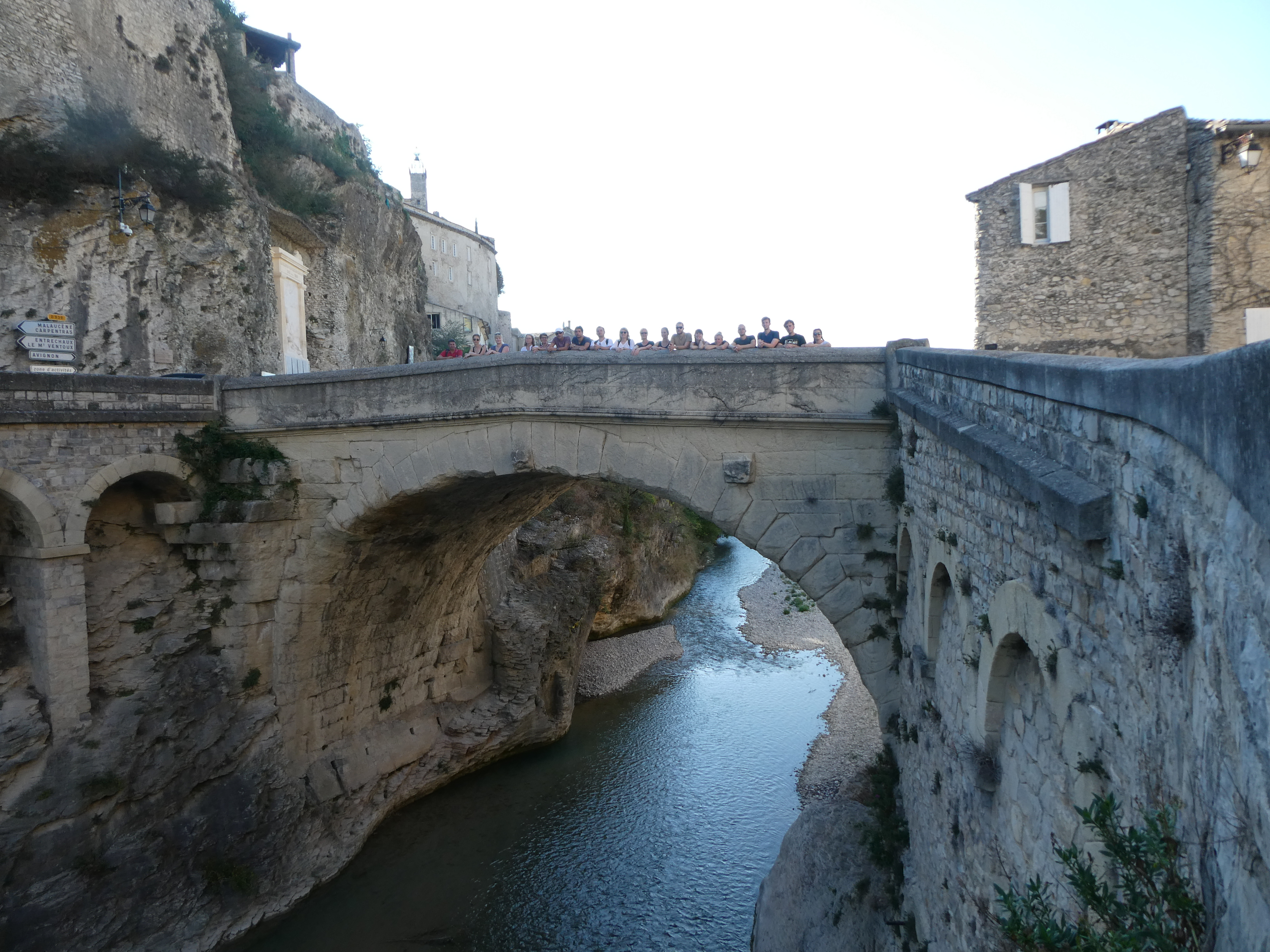 Am siebten Tag besichtigten wir das antike Orange mit Ehrenbogen und sehr gut erhaltenem Theater, in dessen Orchestra drei studentische Grazien in männlicher Begleitung den Kanon „Gaudeamus hodie“ darboten, um uns die gute Akustik vorzuführen. Einige Bruchstücke des Theaters, u.a. Schmuck der Bühnenwand und der Bühne, konnten wir später im kunsthistorischen Museum betrachten. Nach einem Mittagessen im belebten Zentrum der sympathischen Kleinstadt fuhren wir nach Vaison-la-Romaine, wo wir von unseren zwei Führerinnen fachdidaktisch fundiert und mit viel pädagogischem Einfühlungsvermögen durch zwei Ausgrabungsgelände und das Antikenmuseum geleitet wurden; den Abschluss des Tages bildete die Römerbrücke. Ein fröhliches Beisammensein in der Jugendherberge bei selbst mitgebrachten und gekochten Speisen stimmte uns auf den sich langsam nähernden Abschied ein.
