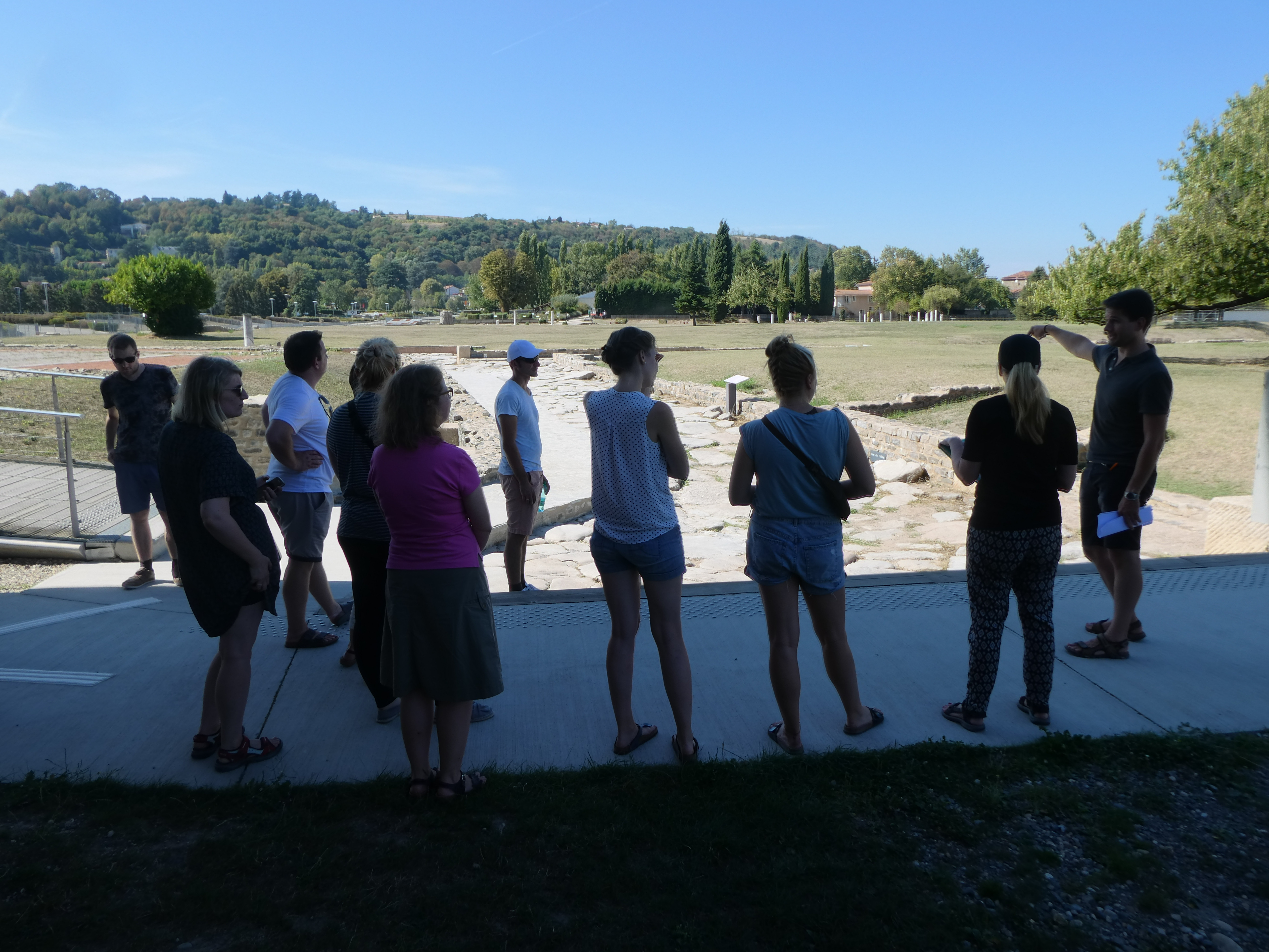 Unsere Besichtigung von Vienne, das wir nach längerer Anfahrt erreichten, begannen wir mit dem antiken Theater, das in den Mont Pipet hineingebaut ist. Leider konnten wir es aufgrund von Bauarbeiten nicht vollständig sehen. Es folgten der archäologische Garten der Kybele mit Resten des antiken Forums und der Podiumstempel, der uns in manchen Details an die Maison Carrée in Nîmes erinnerte. Nach der Mittagspause erhielten wir eine Führung durch das Musée Gallo-Romain Saint-Romain-en-Gal, das über einen ausgedehnten Ausgrabungsbereich verfügt. Im Inneren begeisterten uns besonders die Mosaiken, u.a. eine Darstellung des Lykurg-Mythos und ein schwarz-weißes Mosaik mit einer Darstellung des bärtigen Gottes Okeanos. Den offiziellen Abschluss des Tages bildete ein Besuch des Jardin du 8 mai 1945. Umgeben von blühender südlicher Vegetation liegt dort ein Stück römischer Straße mit Wagenspuren. Einige von uns nutzten noch die Gelegenheit, die gotische Kathedrale St. Maurice zu besuchen.