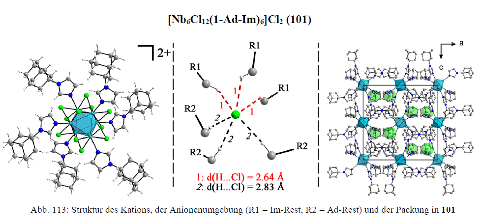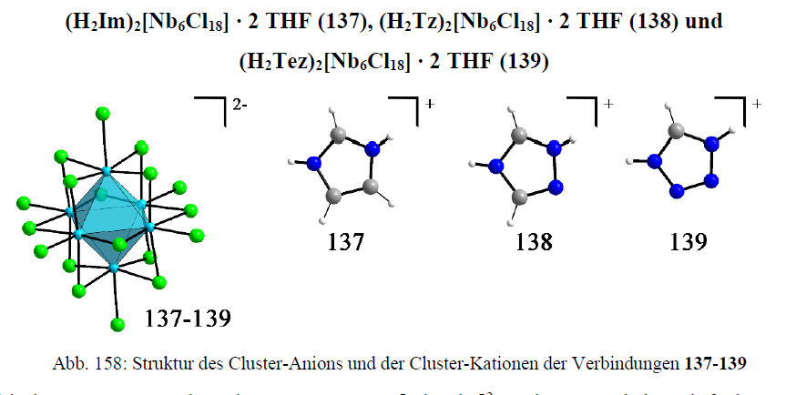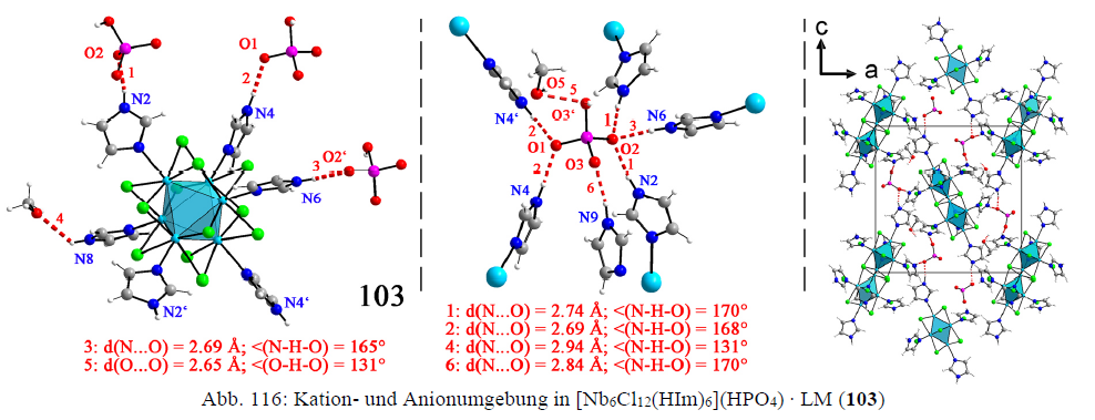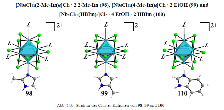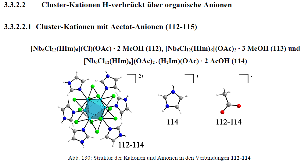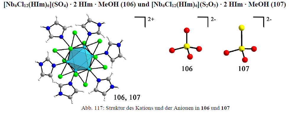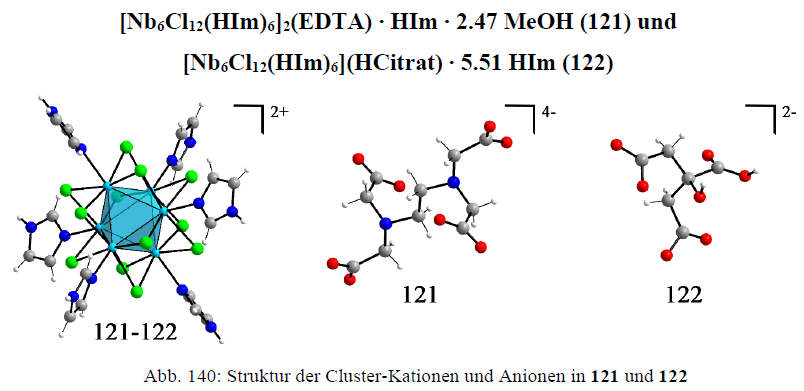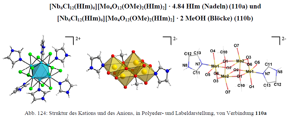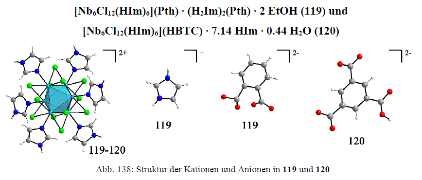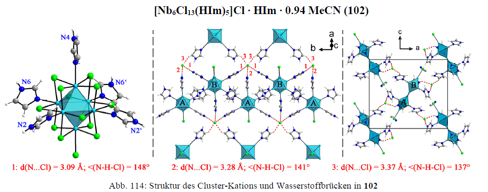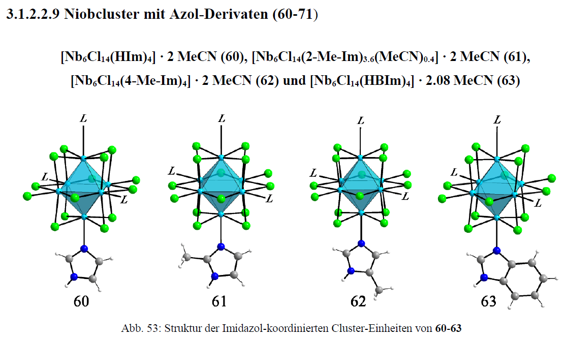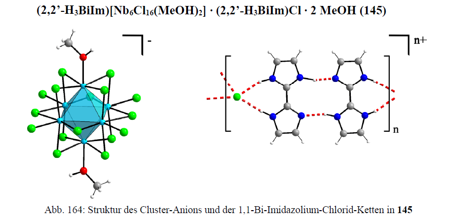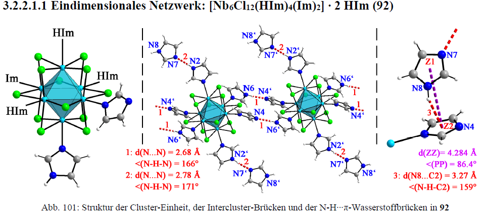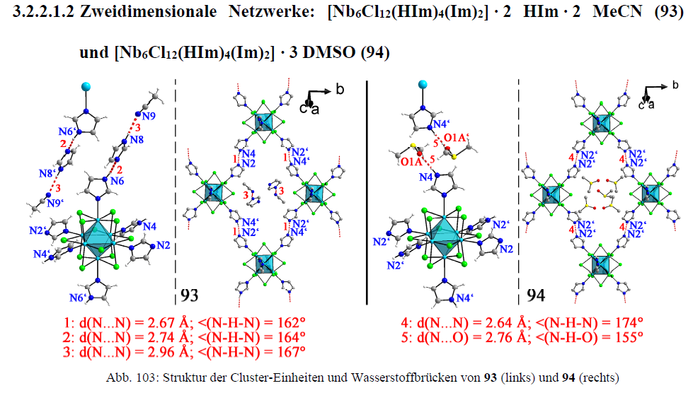 - Zweidimensionale Netzwerke: [Nb6Cl12(HIm)4(Im)2] ∙ 2 HIm ∙ 2 MeCN (93) und [Nb6Cl12(HIm)4(Im)2] ∙ 3 DMSO (94)