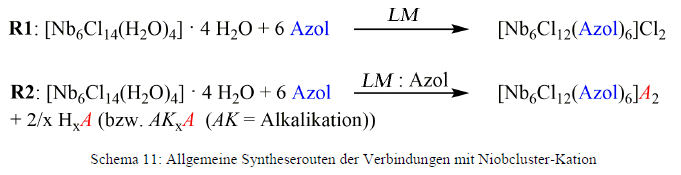 Alle in diesem Kapitel vorgestellten Verbindungen sind aus Azol-koordinierten Cluster-Kationen und verschiedenen Anionen aufgebaut. Dabei handelt es sich um Cl-Anionen (96-102), weitere Mineralsäure-Anionen (103-107), Polyoxometallate (108-111), Acetate (112-115), Carboxylate (116-122) und um das Quadratat-Anion (123). Die Verbindungen mit nicht-Cluster-gebundenen Cl-Anionen unterscheiden sich hinsichtlich des neutralen Azol-Liganden am Kation, so liegen in 96 HIm-Liganden, in 97 HTz-Liganden und in 98-101 2‑Me‑Im, 4-Me-Im, HBIm und Ad-Im-Liganden vor. Die Verbindung [Nb6Cl13(HIm)5]Cl ∙ HIm ∙ 0.94 MeCN (102) stellt den ersten Vertreter sogenannter 6-13er Verbindungen dar. Mit Ausnahme der Verbindungen [Nb6Cl12(HIm)5(Im)](OAc) ∙ 2 HIm ∙ MeOH (115) (ebenfalls 6-13er-Typ), [Nb6Cl12(4-Me-Im)6](Ox) ∙ HCl (118) und [Nb6Cl12(4-Me-Im)6](Qdt) ∙ 4 MeOH (123) enthalten alle weiteren Verbindungen in diesem Kapitel das [Nb6Cl12(HIm)6]2+-Kation. In der Literatur sind bisher nicht sehr viele Verbindungen mit Niobcluster-Kationen bekannt, bisher wurde lediglich von sechs Vertretern berichtet (siehe Einleitung - Tab. 1, S. 9). In allen hier vorgestellten Cluster-Verbindungen liegen starke, ausgedehnte Wasserstoffbrücken-Netzwerke zwischen den Cluster-Kationen, den Anionen und co‑kristallinen Molekülen vor. Die Synthese der Verbindungen mit Cl-Gegenionen erfolgte durch die Umsetzung von [Nb6Cl14(H2O)4] ∙ 4 H2O mit dem Azol nach Schema 11 (R1). Alle weiteren Synthesen (mit Ausnahme der POM-haltigen Verbindungen und Verbindung 120) wurden durch die Umsetzung des Wasser-koordinierten Präkursors mit der Säure oder dem Alkalisalz des entsprechenden Anions in einer Mischung aus dem Imidazol und einem Lösungsmittel nach Schema 11 (R2) erhalten. Der postulierte Reaktionsweg zur Bildung der POM-Anionen ist in den entsprechenden Kapiteln oder im Anhang (5.3) angegeben, Verbindung 120 wurde aus [Nb6Cl12(MeOH)4(OMe)2] ∙ DABCO ∙ 1.66 CH2Cl2 (95) dargestellt, die Synthese ist im Anhang aufgeführt.