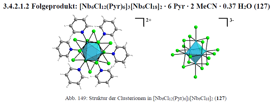 - Folgeprodukt: [Nb6Cl12(Pyr)6]3[Nb6Cl18]2 ∙ 6 Pyr ∙ 2 MeCN ∙ 0.37 H2O (127)