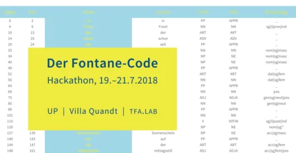 Diesen Gedanken wollen wir aufgreifen und ausweiten: Für und im Zuge des (computer-)philologischen Hackathons »Der Fontane Code« wandelt sich das Theodor-Fontane-Archiv (TFA) zu einem geisteswissenschaftlichem Labor, einem Humanities Lab (dem TFA.LAB), in dem interdisziplinäre Teams aus Philologie, Informationswissenschaften, Computerlinguistik, aus Design und Gestaltung auf kuratierten Daten zu Theodor Fontanes Werken und Schriften digitale Analysen durchführen, ihre Methoden und Ergebnisse miteinander diskutieren und sich in Interpretationen dieser Ergebnisse versuchen können.