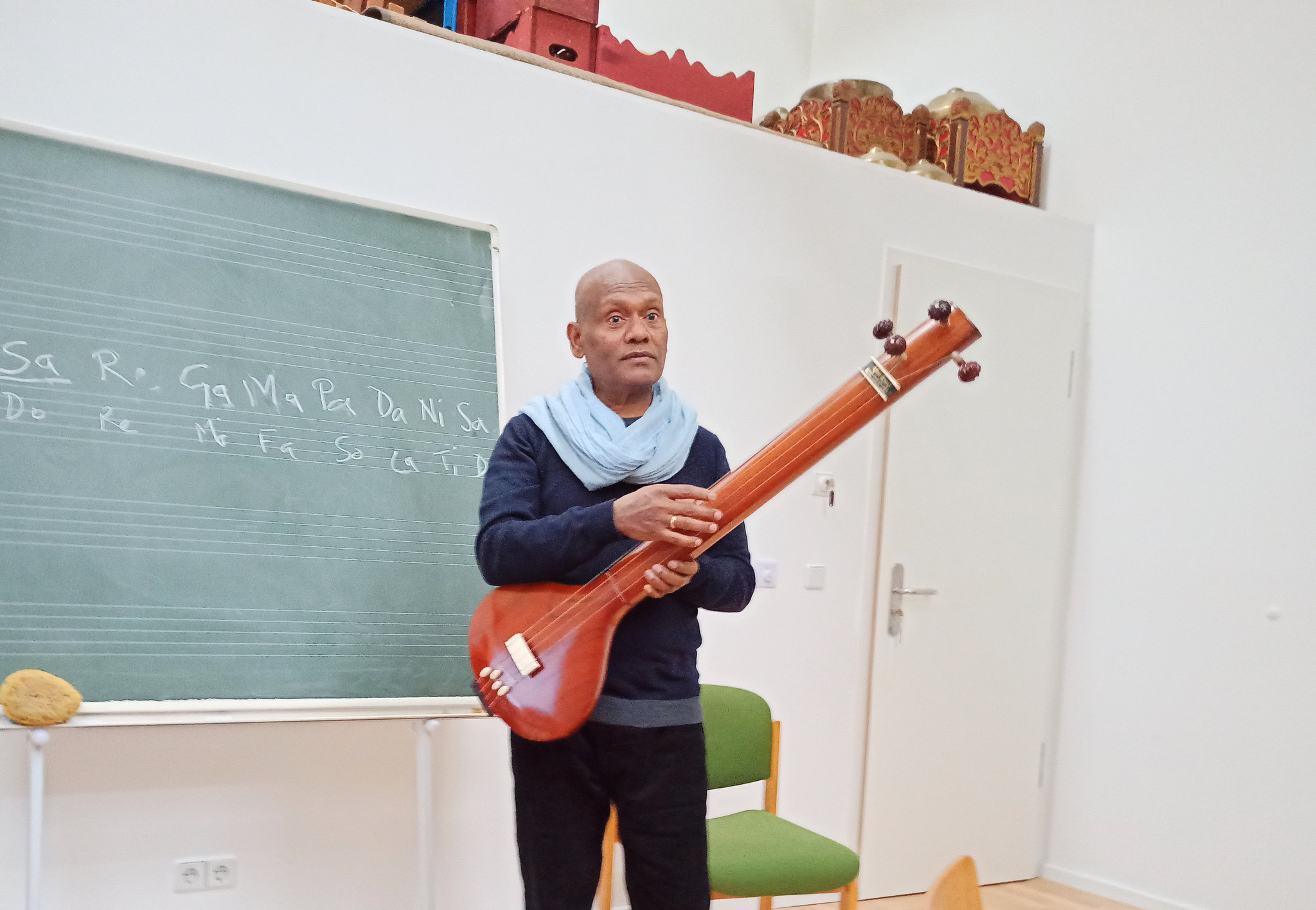 So erhielten die Studierenden exemplarisch eine praktische Einführung in die Karnatische Musik, vermittelt von dem Sänger Manickam Yogeswaran. Diese in Südindien und Sri Lanka verbreitete Kunstmusik basiert auf melodischen Ragas sowie rhythmischen Talas, mit denen Modi und Formen für vokale Improvisation und Komposition vorgegeben werden. Zum Erlernen solcher Strukturen dienen Solfège-Übungen. Unter Anleitung gelang es der Gruppe, einfache Ragas mit typischen melodischen Wendungen zu singen und in additiver Rhythmik eines spezifischen Talas eine kleine Melodie zu komponieren. Im Gespräch mit Manickam Yogeswaran wurde gemeinsam darüber reflektiert, inwieweit die kulturelle Praxis der karnatischen Musik im westlichen Kontext adaptiert werden kann und welche Grenzen bestehen – hinsichtlich eines authentischen Musizierens sowie hinsichtlich einer Sensibilität gegenüber dieser südasiatischen Musikkultur, die in Bezug auf die heute umstrittene ‚kulturelle Aneignung‘ in besonderem Maße geboten scheint.
