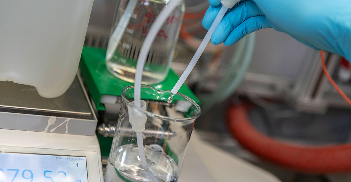 - Aaron Justin Koenig gibt die Dosierungsschläuche in die Chemikalienbehälter mit Schwefelsäure bzw. Wasserglas und hängt die pH-Sonde zur Überwachung der Neutralisationsreaktion in den Reaktor ein.