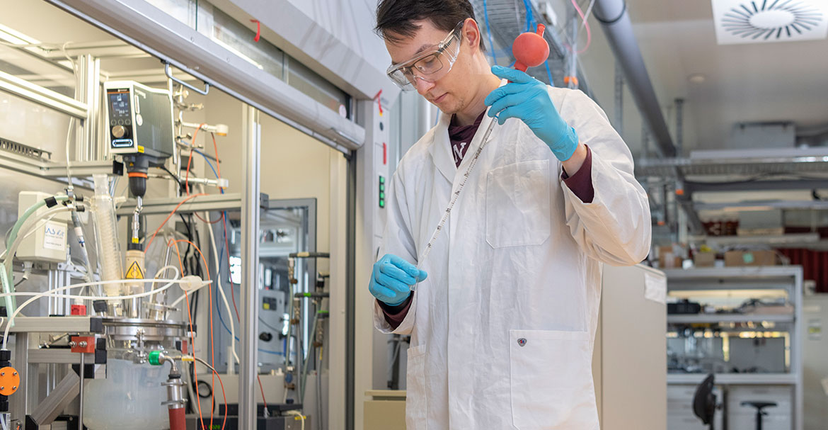 - Während die Chemikalien in den Reaktor gepumpt werden, entnimmt Aaron Justin Koenig alle fünf Minuten mit einer Glaspipette eine Probe aus der gemischten Lösung. Diese Proben werden für eine andere Technik im Nebenlabor verwendet: die dynamische Lichtstreuung zur Messung der Partikelgrößenverteilung.