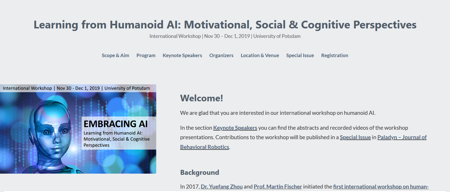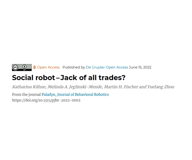 Dr. Yuefang Zhou ist Gastredakteur einer Sonderausgabe zum Thema “Learning from Humanoid AI: Motivational, Social and Cognitive Perspectives” in Paladyn, Journal of Behavioral Robotics. Diese thematische Sonderausgabe widmet sich der Veröffentlichung hochwertiger Forschungsarbeiten, die teilweise auf dem internationalen Workshop Internationalen Workshop „Learning from humanoid AI: Motivational, Social and Cognitive Perspectives“ vorgestellt werden sollen. Ziel des Workshops ist es, einige der grundlegenden Fragen der Mensch-Roboter-Interaktion zu beantworten. Gibt es beispielsweise einige allgemeine Prinzipien der Mensch-Roboter-Interaktion, die Roboterkonstruktionen in verschiedenen Bereichen wie Gesundheitswesen, Bildung und Unterhaltung beeinflussen können? Wie können wir aus verschiedenen Perspektiven lernen, um gemeinsame Prinzipien für eine verbesserte Mensch-Roboter-Interaktion zu nutzen?