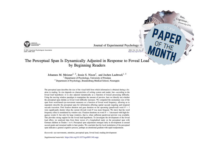 Johannes Meixner und Jochen Laubrock wurden für Ihre Veröffentlichung “Executive functioning predicts development of reading skill and perceptual span seven years later” im Journal of Memory and Language (2024) mit dem UFSKW Paper of the Month Award (Mai 2024) ausgezeichnet. https://doi.org/10.1016/j.jml.2024.104511