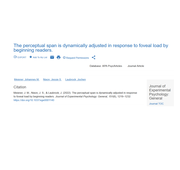 - Meixner, J., & Laubrock, J. Development of the Perceptual Span during Reading. ESCoP Porto.