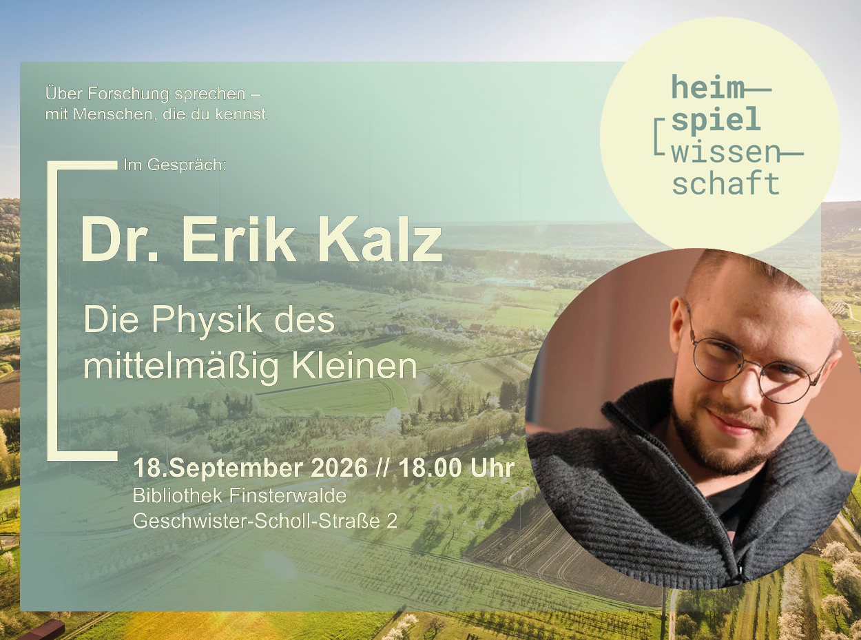 Dr. Erik Kalz lädt zum „Heimspiel Wissenschaft” nach Finsterwalde ein. In seinem Vortrag „Die Physik des mittelmäßig Kleinen” spricht er über Konzepte der theoretischen Physik, die helfen, das Verhalten von Kleinstlebewesen wie Bakterien oder die Bewegungsmuster von Vogelschwärmen zu verstehen und zu beschreiben – kurz: Ordnung und Struktur in komplexen Systemen zu erkennen.