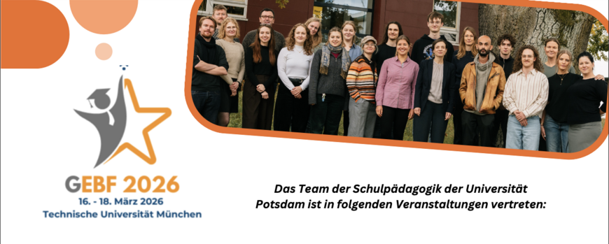 Mit Klick auf diesen Flyer sehen Sie alle Veranstaltungen, bei denen Mitarbeitende des Teams Schulpädagogik der Universität Potsdam auf der GEBF 2026 präsentierend vertreten sind. Wir freuen uns auf einen guten wissenschaftlichen Austausch und inspirierende Talks!