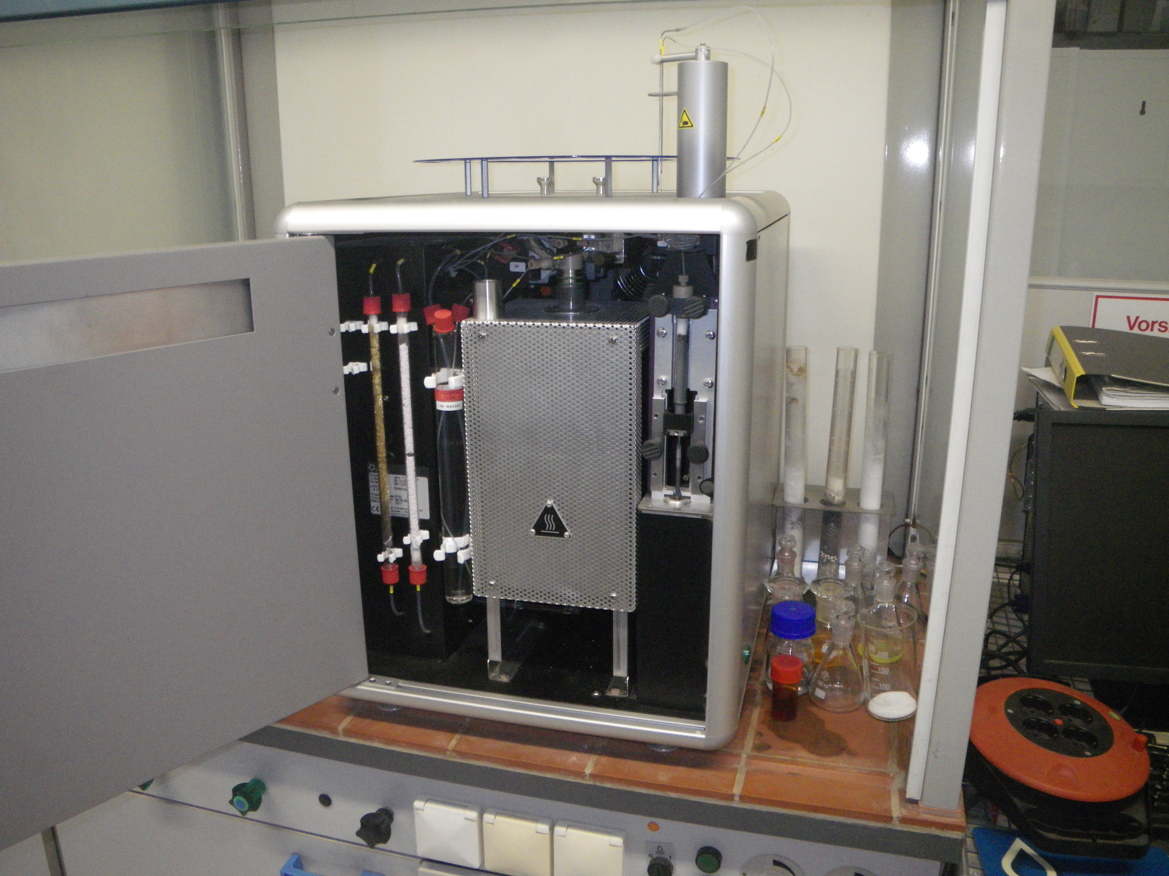 Eine Analyseeinheit zur Erfassung verschiedener Kohlenstofffraktionen (TOC, NPOC, TC, TIC) kann zur Untersuchung von flüssigen wie festen Proben genutzt werden. Die Bestimmungsgrenze der Anlage liegt bei 1 ppm.