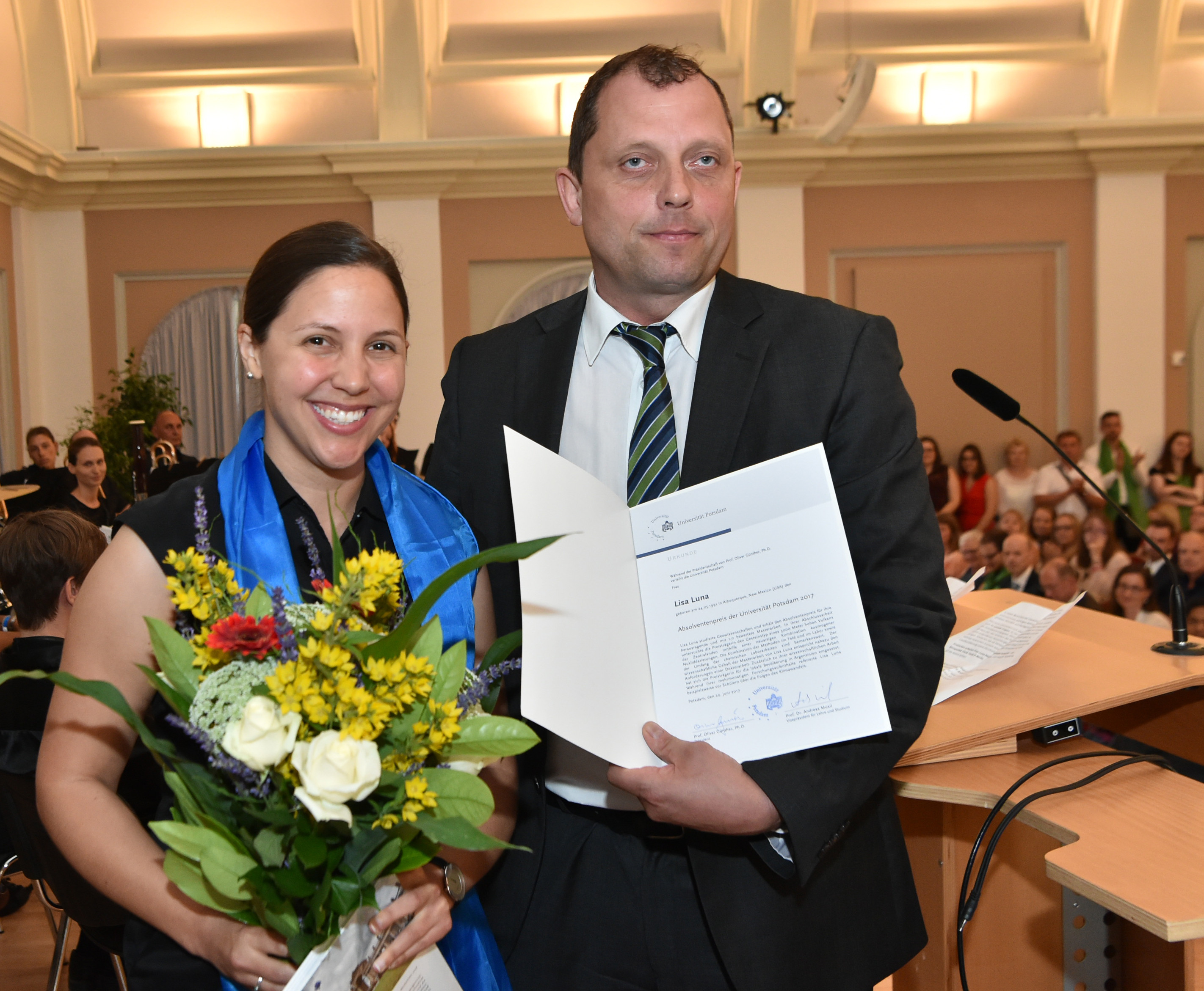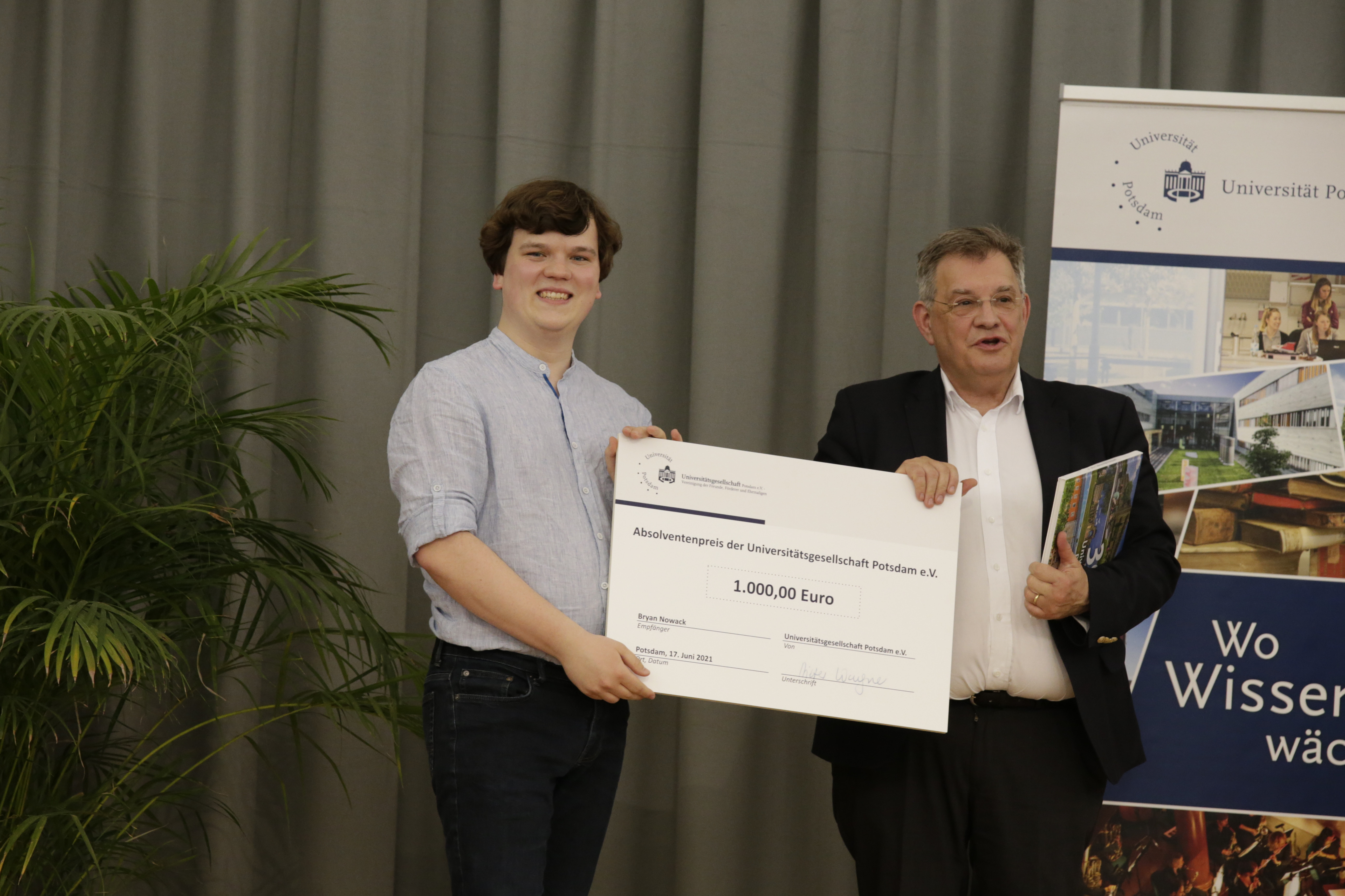 Lars Masanneck (M.) erhielt den Absolventenpreis 2024 von Barbara Obst-Hantel, Vorstandsvorsitzende der Universitätsgesellschaft Potsdam e.V. (R.)