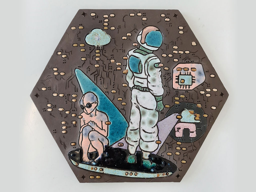 Im Rahmen eines moderierten Künstlerin-Gesprächs wird die Installation 2022 entstandene Keramik PFA_POST-FUTURISTIC-ARCHEOLOGY_BTP_Hexaginoc-Pictoglyphs-XL07_HUMAN BASICS von Katrin Leitner eingeweiht. Im Mittelpunkt des dritten Moduls des von der Stiftung Kunstfonds NEUSTARTplus Plattformen der Bildenden Kunst geförderten Programms stehen die Themen Algorithmensucht, digitale Abhängigkeit & analoge Detoxifikation. Die Veranstaltungsreihe wird von Verena Voigt M.A. (GFZK e.V.) in Zusammenarbeit mit Univ.-Prof. Dr. Norbert Gronau, Leiter des Instituts für Wirtschaftsinformatik, Prozesse und Systeme (Karl-Marx-Str. 67) organisiert.