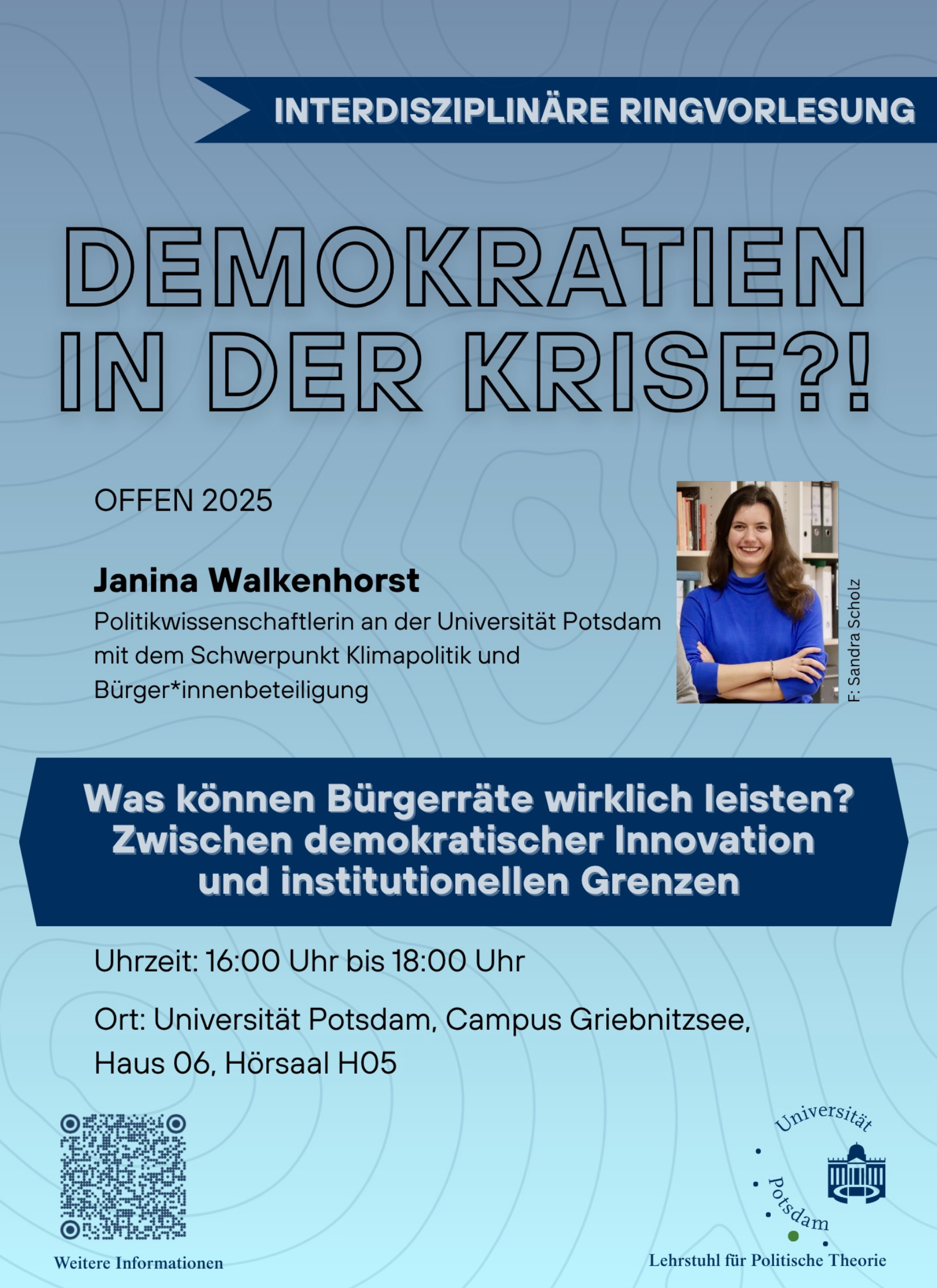 Im Rahmen der öffentlichen Ringvorlesung „Demokratien in der Krise“ Am 21. Oktober hält Janina Walkenhorst eine Vorlesung zu dem Thema „Was können Bürgerräte wirklich leisten? Zwischen demokratischer Innovation und institutionellen Grenzen“. Eingeladen sind alle Interessierten. Die Veranstaltung wird in deutscher Lautsprache stattfinden, eine Anmeldung ist nicht erforderlich.