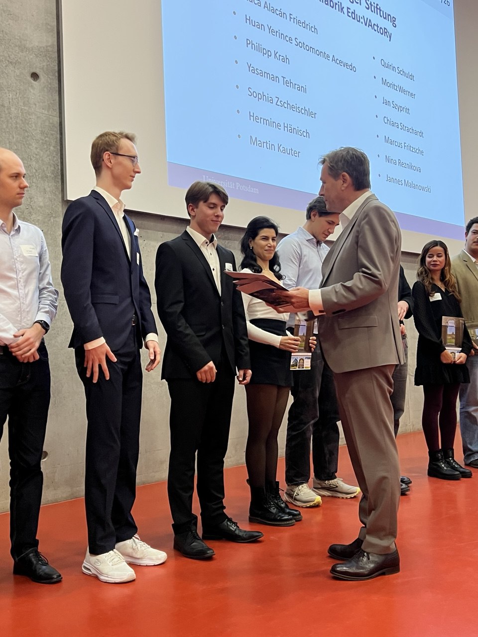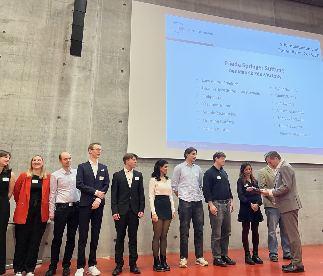 Im Rahmen der Veranstaltung wurde auch die neue Denkfabrik „VR in der Lehrkräftebildung Edu:VActoRy” vorgestellt, die ab dem Wintersemester 2025/26 interessierten und engagierten Studierenden einen Rahmen und Unterstützung bietet, innovative Lern- und Forschungsprojekte im Bereich Virtual- und Augmented-Reality umzusetzen. Die beteiligten Stipendiat:innen erhielten dabei Gelegenheit, erste Einblicke in die thematischen Schwerpunkte ihrer Denkfabrik-Projekte zu geben. Drei Stipendien wurden dabei an Studierende des Fachbereichs WAT vergeben. Wir gratulieren herzlich Chiara Strachard, Quirin Schuldt und Moritz Werner und wünschen Ihnen bei der Umsetzung ihrer Projekte viel Spaß und Erfolg!