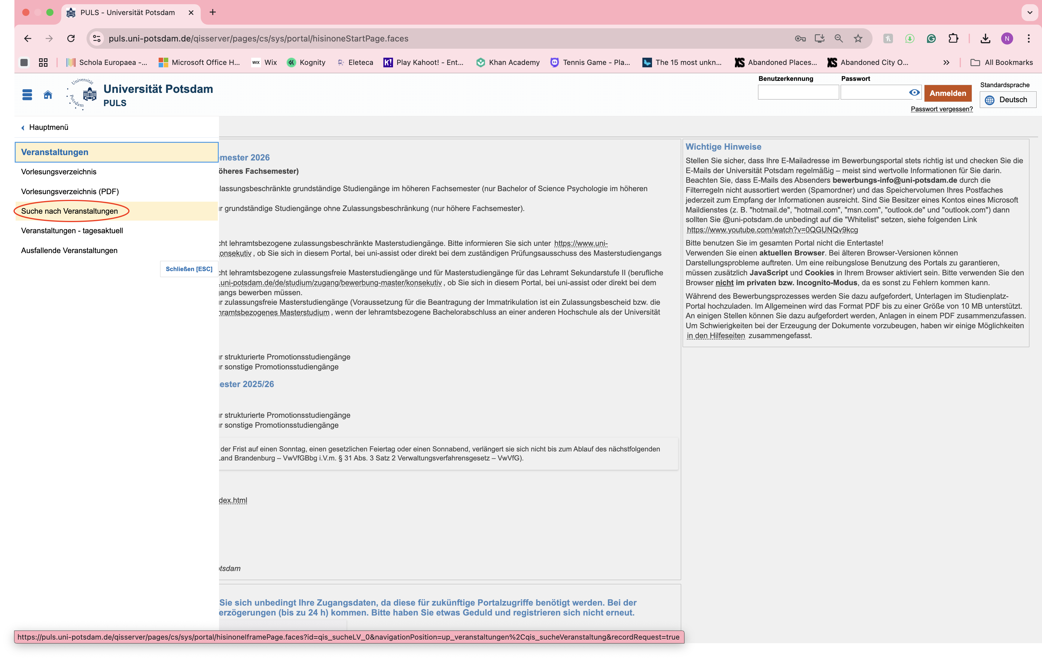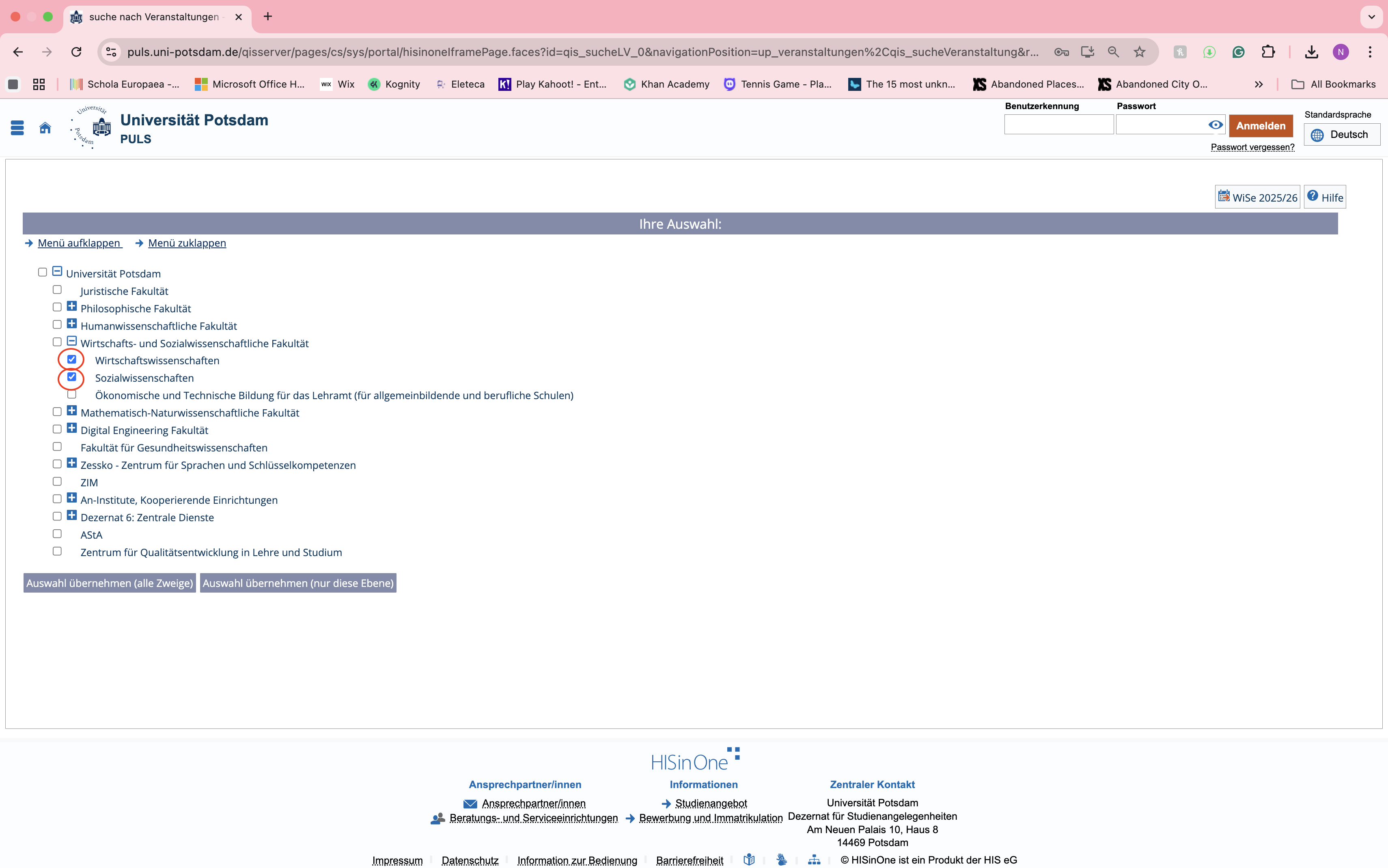 - unter Veranstaltungen gehen Sie auf "Suche nach Veranstaltungen". Sie können dort nach englischsprachigen Lehrveranstaltungen filtern und nach der Einrichtung (Wirtschaftswissenschaften bzw. Sozialwissenschaften- richten Sie sich dabei nach Ihrem Studiengang).