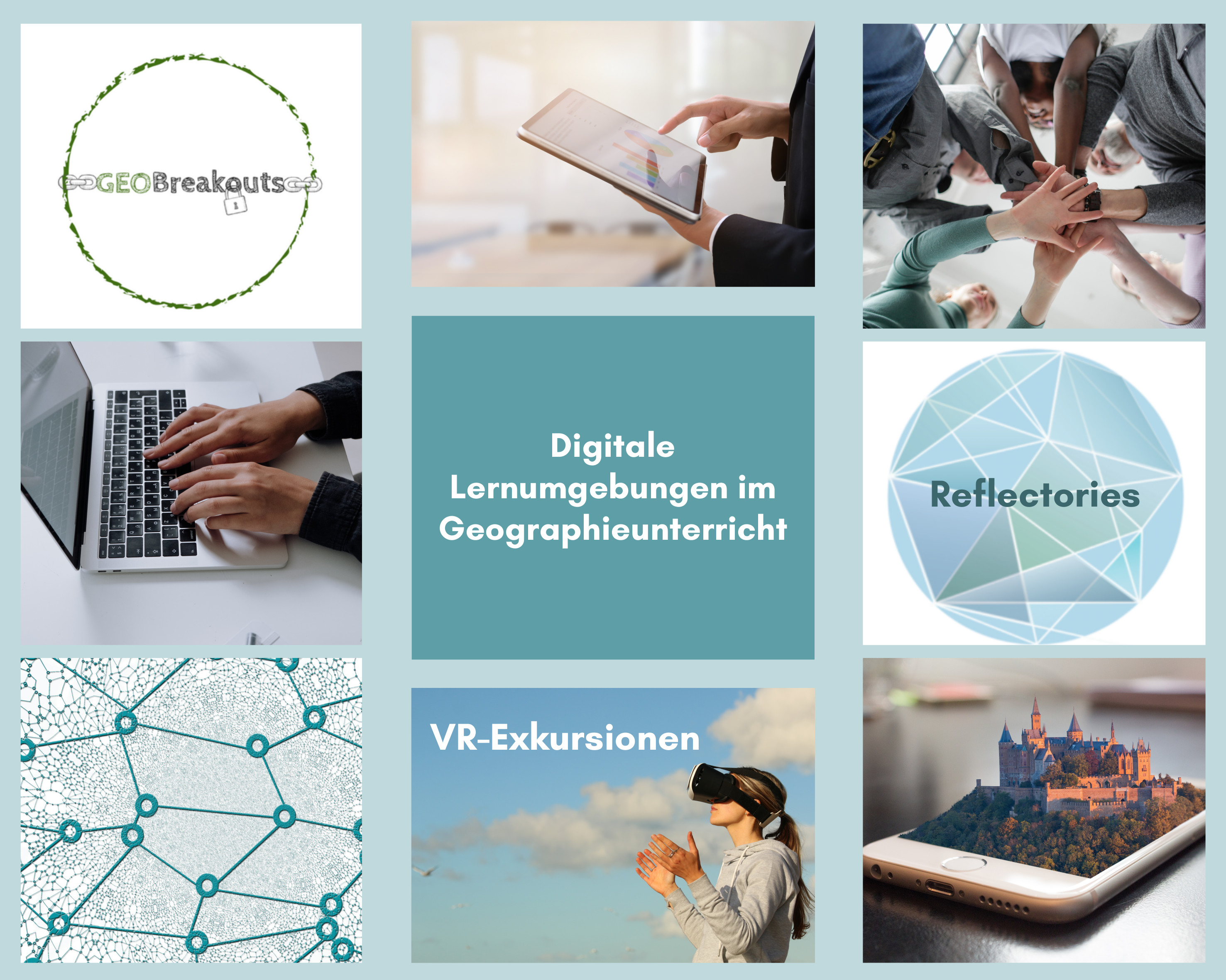 Bei den entwickelten digitalen Lernumgebungen handelt es sich um VR-Exkursionen (Virtual-Reality-Lernumgebungen), Reflectories (digitale Lernumgebungen zu den Sustainable Development Goals) und GEOBreakouts (Escape Games für den Geographieunterricht).