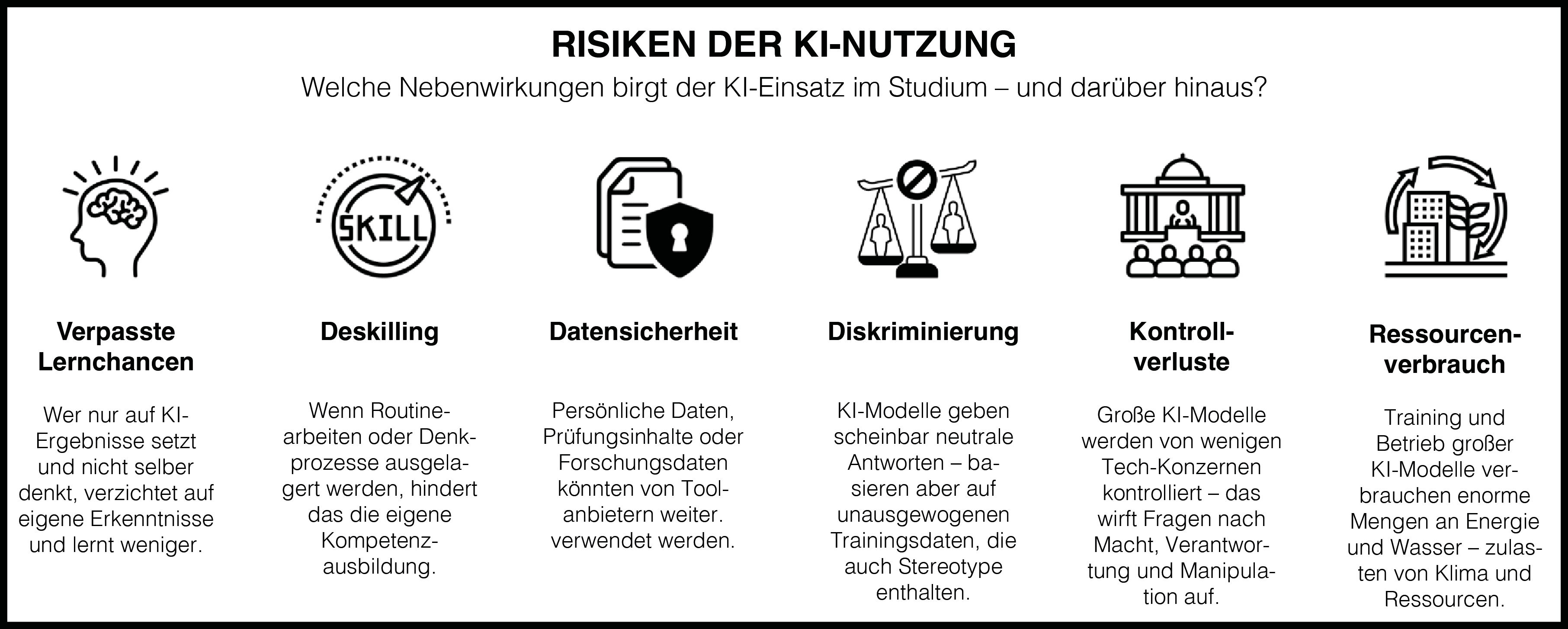 - Die UHH sammelt auf ihrer Webseite weiterführende Inhalte – Artikel, Videos, Podcasts und Interviews – für Lehrende und Studierende, damit diese die Nebenwirkungen und Herausforderungen von KI im Studium und darüber hinaus besser einordnen zu können.