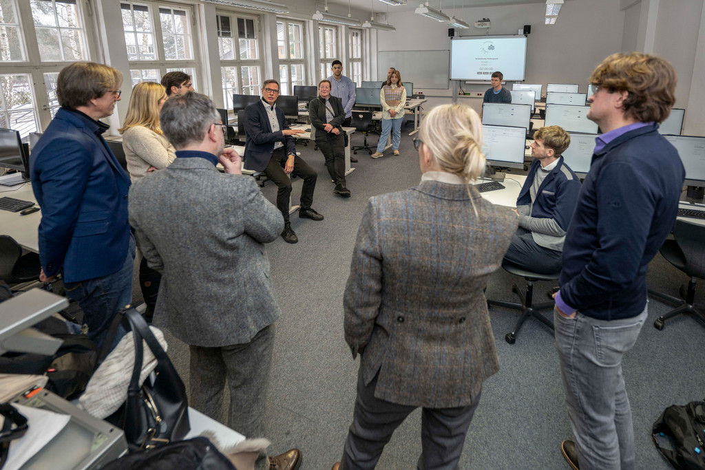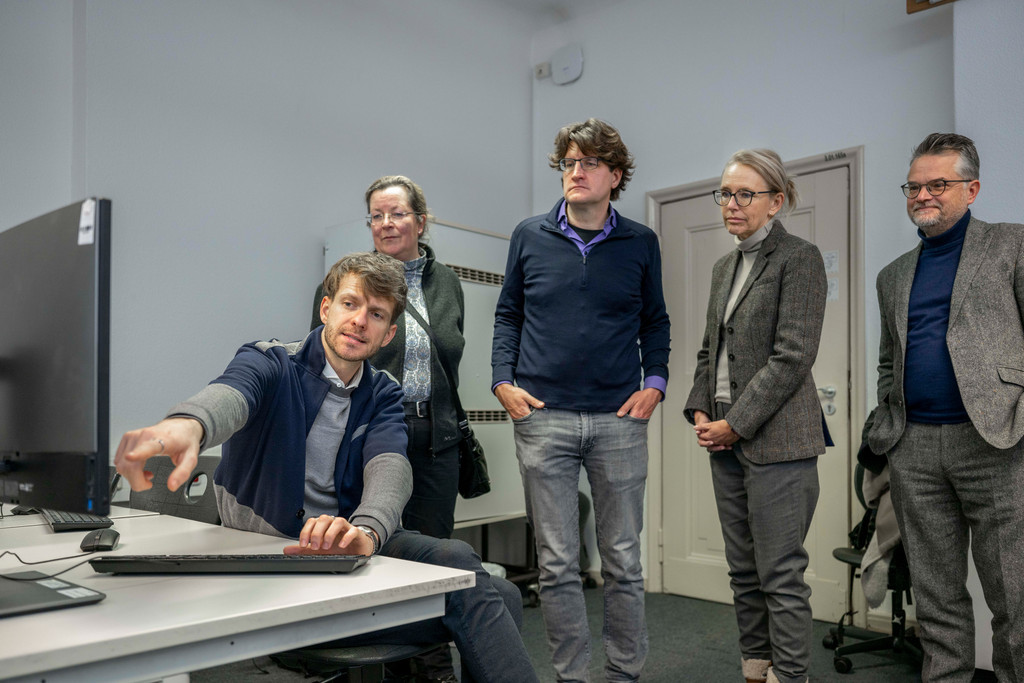 Die Organisatoren und Gäste der digitalen Probeklausur besuchen vorab den Prüfungsraum. In der Mitte (sprechend): Alexander Schulz, Leiter des ZIM der Universität Potsdam. Foto: Thomas Roese