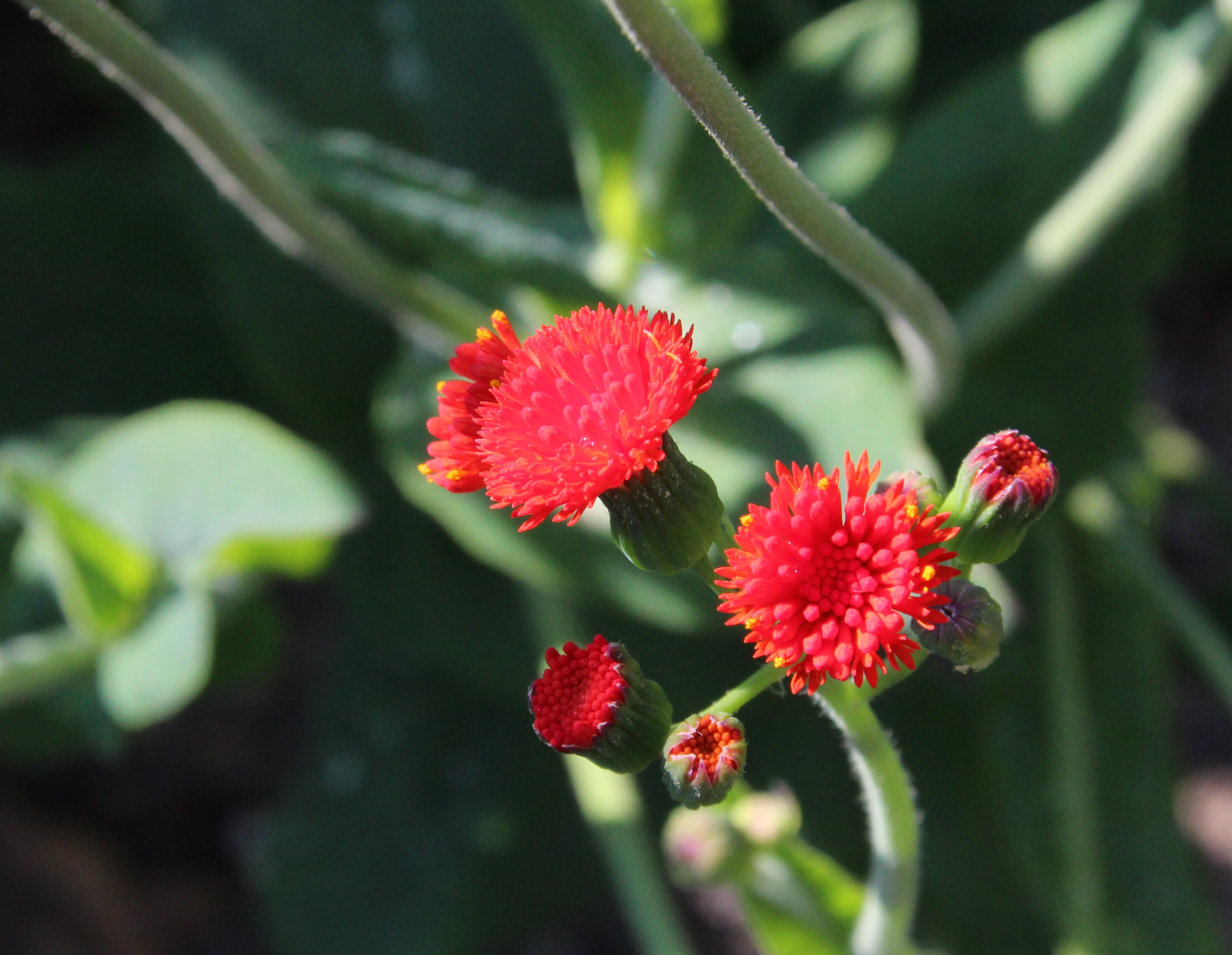 Der Artname sagt es, Emilia coccinea hat leuchtend orangerote Blüten. Sie gehört zur Familie der Korbblütler, mit rund 25.000 Arten die zweitgrößte Pflanzenfamilie. (Die Orchideen sind mit 26.000 Arten noch etwas umfangreicher.) Die roten Blumenköpfe bestehen familientypisch aus einer Vielzahl kleiner Einzelblüten, wie bei Gänseblümchen und Sonnenblume, allerdings fehlen der Emilie die zungenförmigen Randblüten. Der Gattungsname ehrt vermutlich die französische Physikerin Émilie du Châtelet (1706-1749), die zusammen mit ihrem Geliebten Voltaire die Newtonsche Physik in Frankreich bekannt machte, indem sie seine Texte aus dem Lateinischen ins Französische übersetzte und seine Mathematik in Leibnizsche Infinitesimal-Notation übertrug.