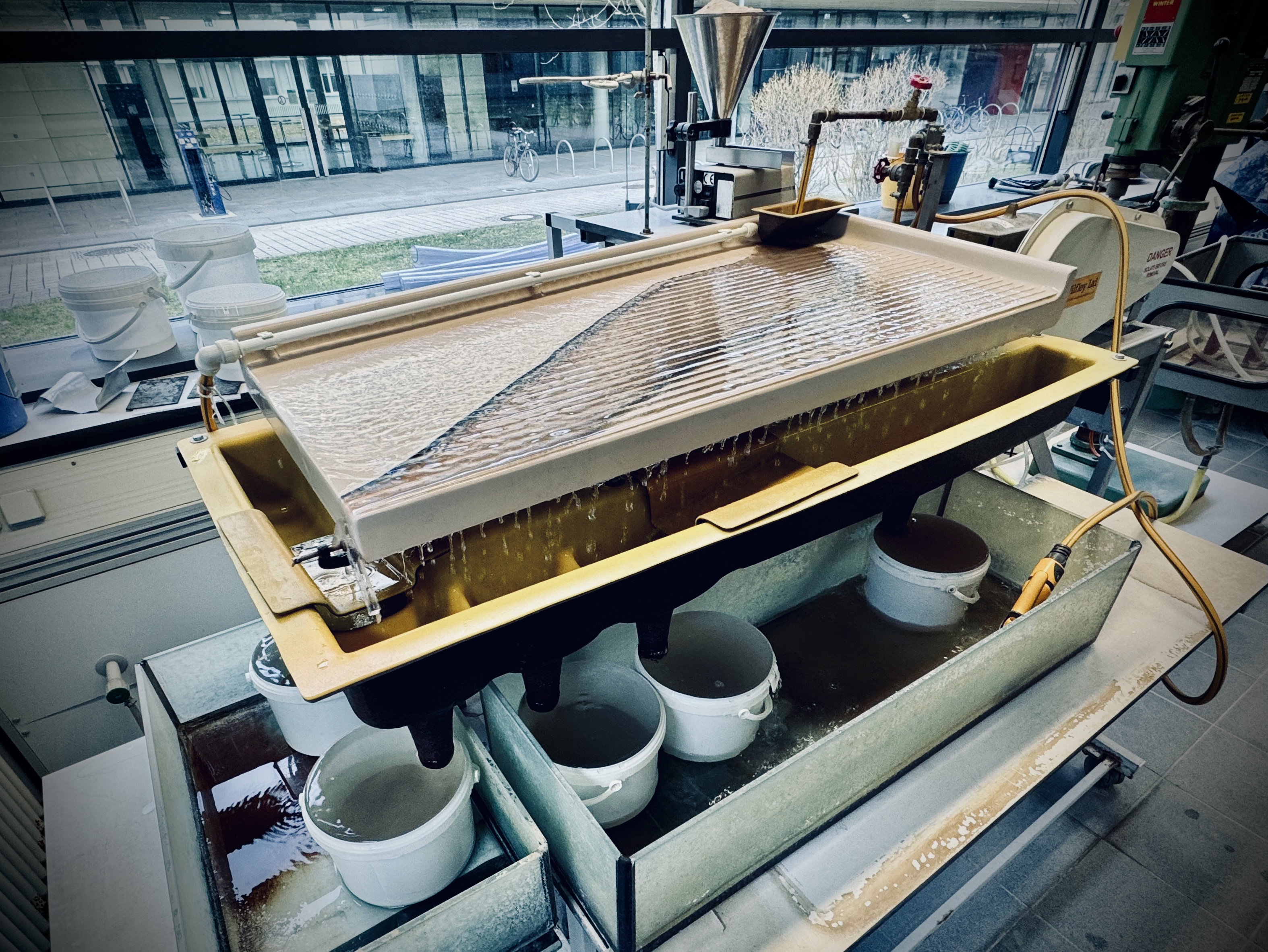- Mechanical density separation: A Wilfley table (shaking table) for efficient separation of mineral phases based on density and grain shape, especially for the preliminary concentration of heavy minerals.