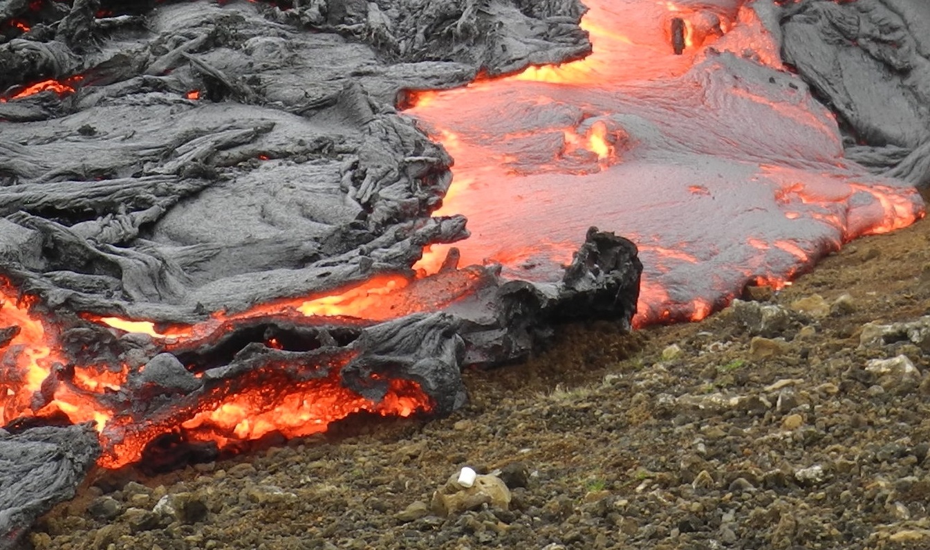 Image 1: Lava flow field during the Meradalir eruption in 2022. The photo was taken within 24 h of the eruption onset and the elongated fissure that effuses lava is still visible. Photo: Eva Eibl.